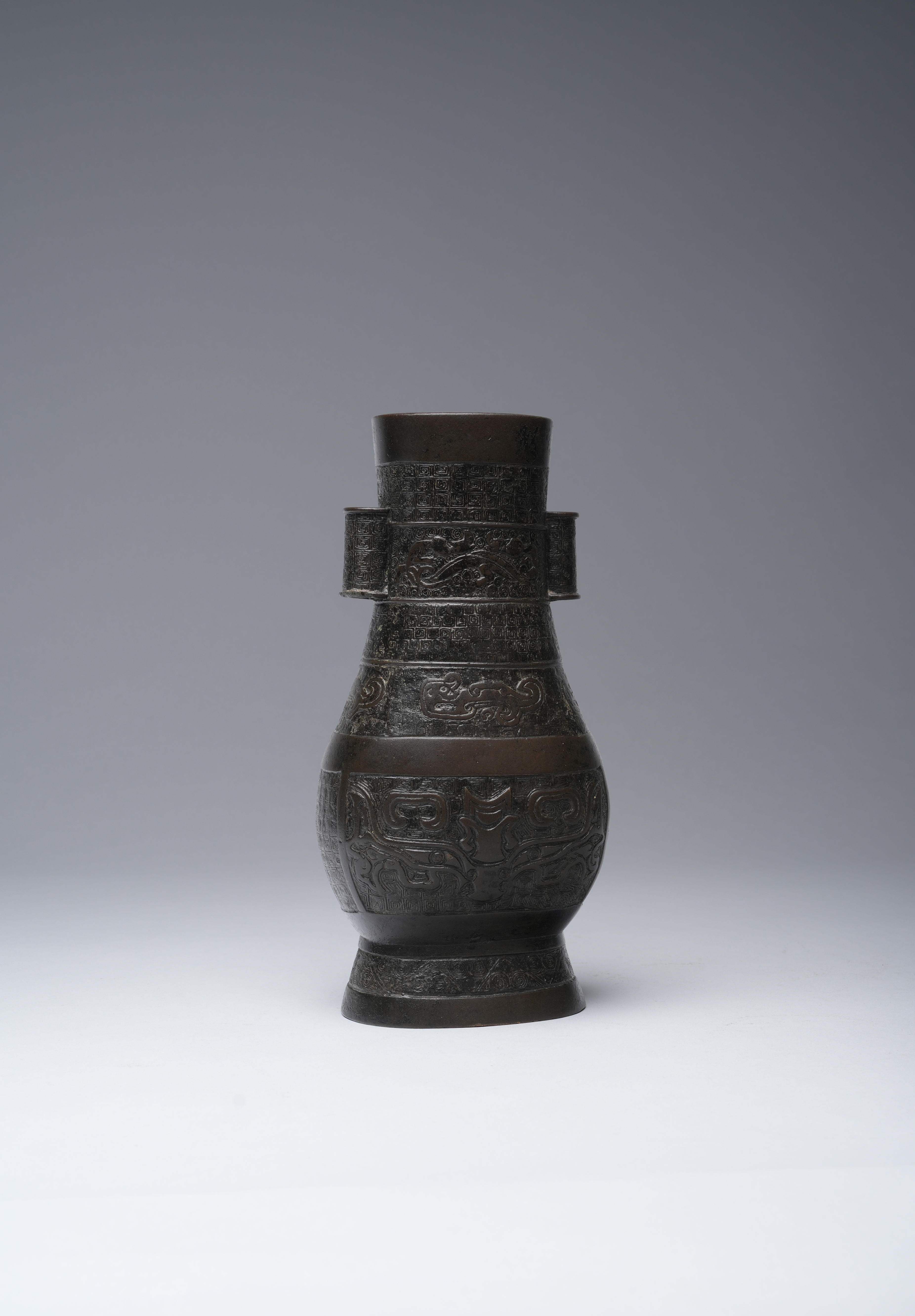 The body raised on a splayed foot and the neck flanked by a pair of tubular handles, decorated with bands of leiwen, stylised chilong, taotie and geometric patterns, the base with three characters reading xian shiyi, with a paper label for the Finer Collection 'CB 119', 1.3kg, 26cm.