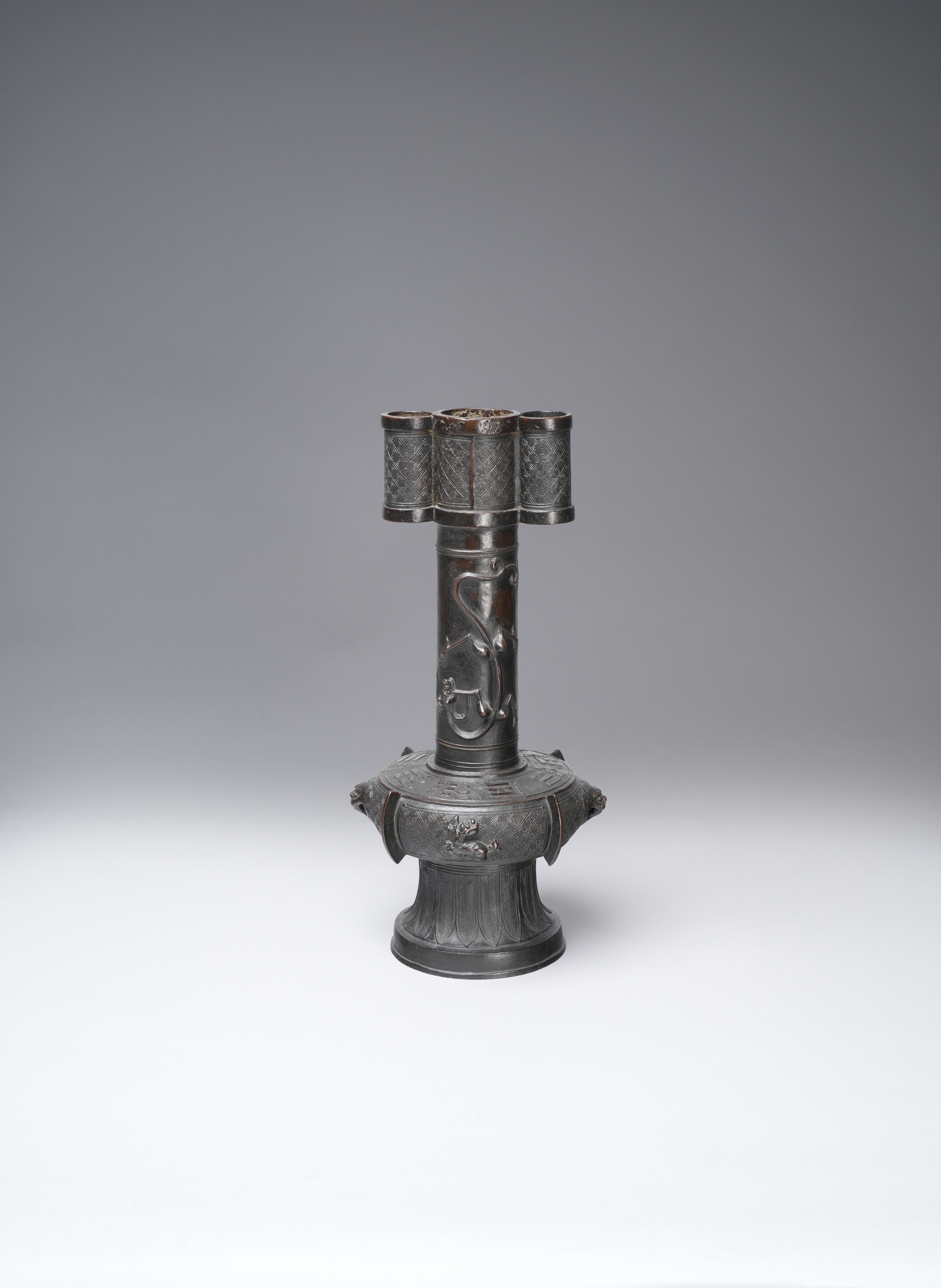 The compressed globular body raised on a high foot decorated with lappets, the body decorated with two lion masks and a further two animals divided by flanges below a band of the ba gua, the tall cylindrical neck with two tubular rings and decorated with two sinuous chilong, with a paper label for the Finer Collection 'CB 28', 6.5kg, 49.6cm.