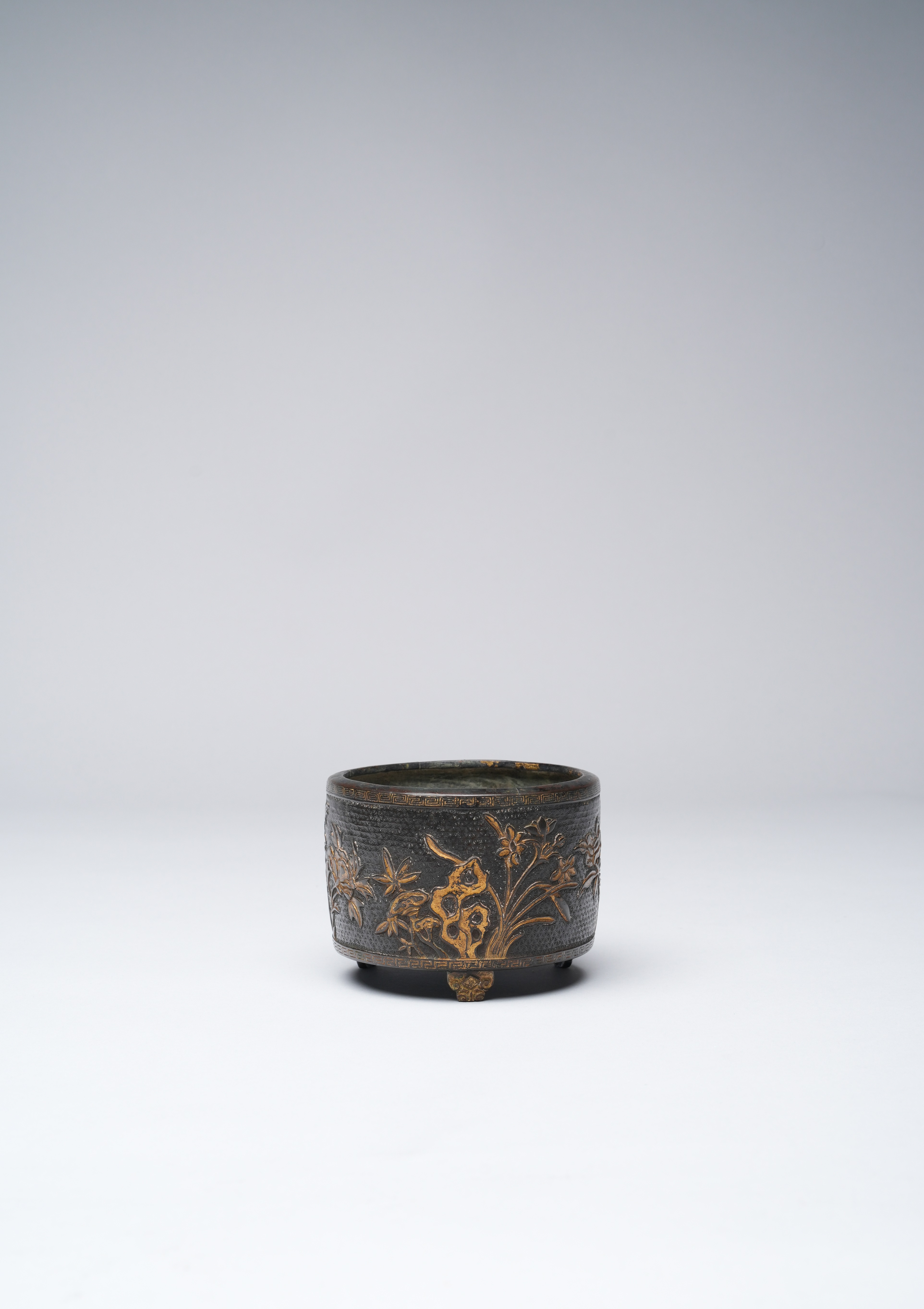 Of rounded cylindrical form raised on three taotie feet, the exterior decorated with a central band of flowering plants, including lotus, bamboo, peony and chrysanthemum all reserved against a diaper ground, between key-fret bands to the rim and foot, the base with the four-character mark reading Hu Wenming zhi, with a paper label for the Finer Collection 'CB 90', 376g, 10.3cm.
