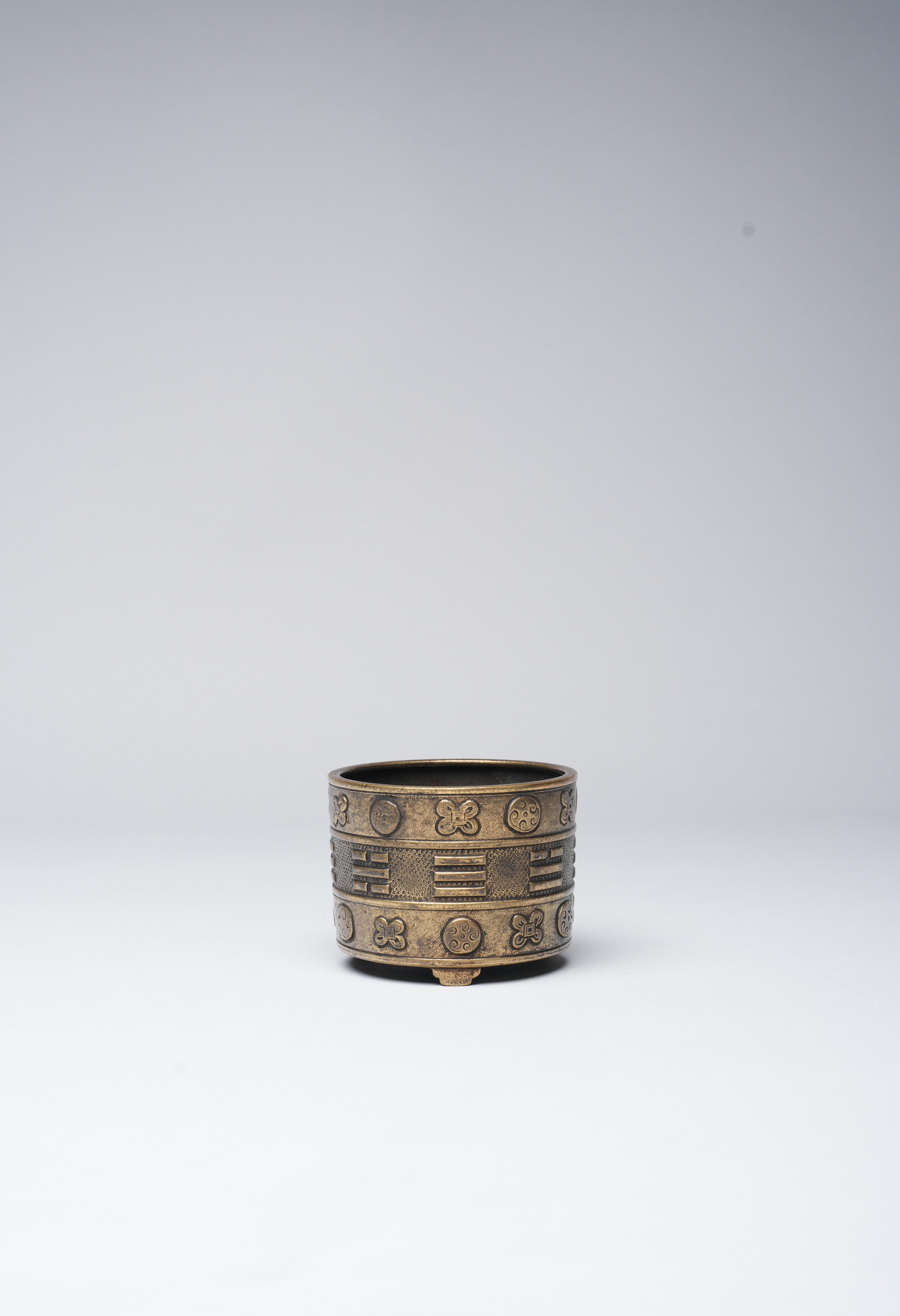 A CHINESE GILT-COPPER ALLOY ‘BA GUA’ TRIPOD INCENSE BURNER