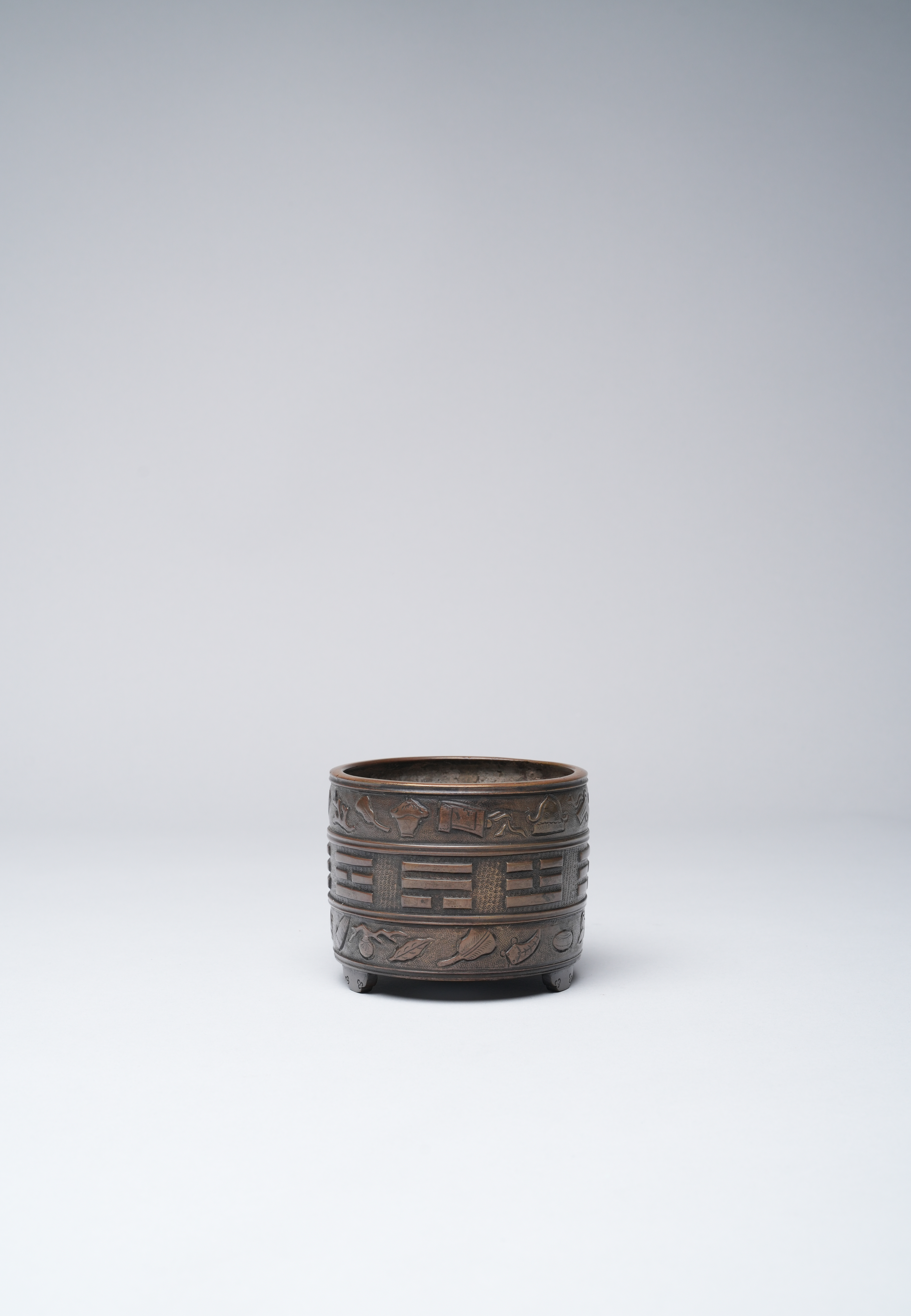 A CHINESE COPPER ALLOY ‘BA GUA’ TRIPOD INCENSE BURNER