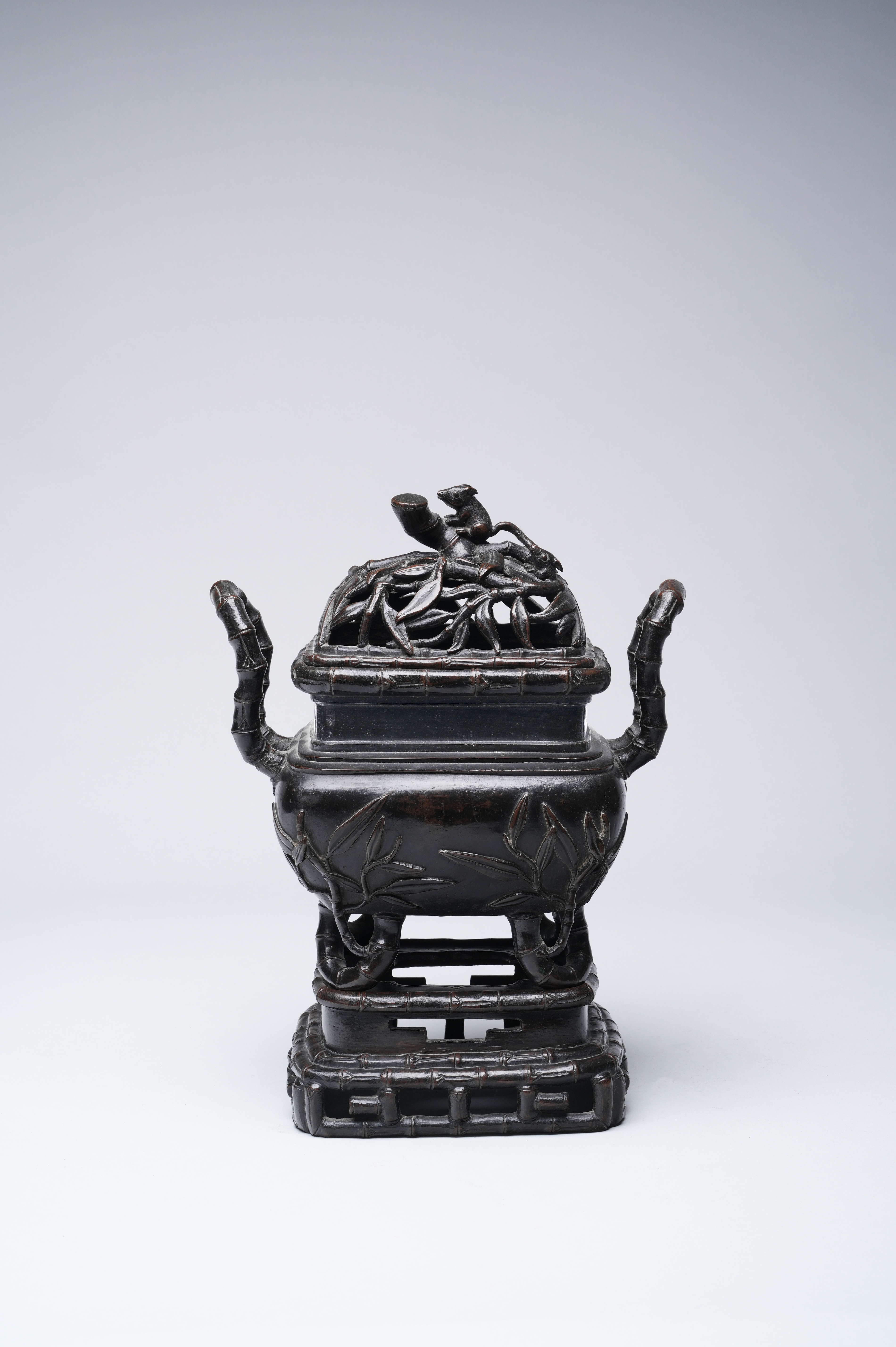 Cast to simulate bamboo, the reticulated cover with two squirrels, one forming the knop, the rectangular body with upright loop handles, with a paper label for the Finer Collection 'CB 10', 7.4kg, 34 cm. (3)