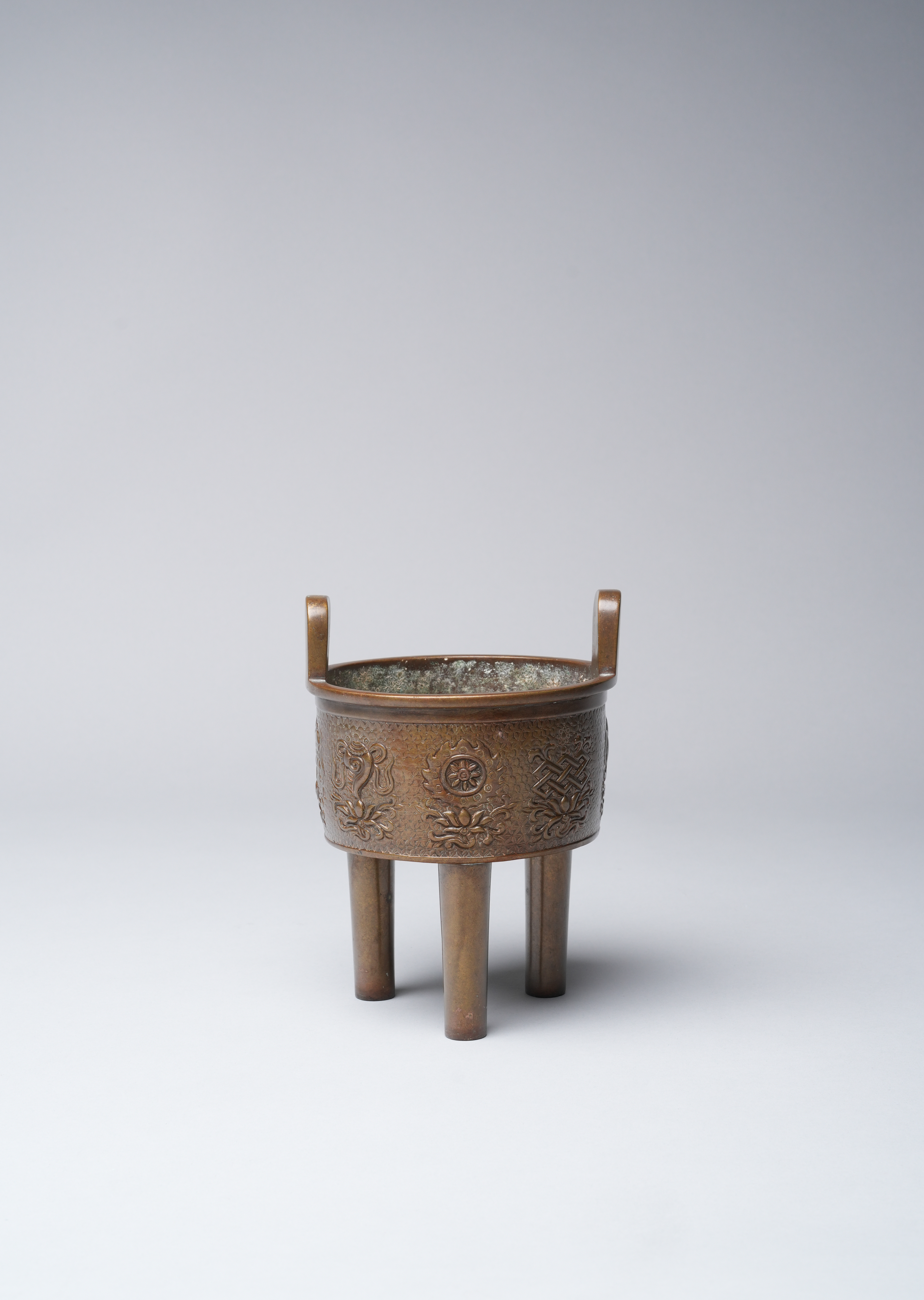 The cylindrical body cast with the Eight Buddhist Emblems on a flowerhead diaper ground, with upright handles and tall cylindrical legs, with a paper label for the Finer Collection 'CB 9', 1.2kg, 18.5cm.