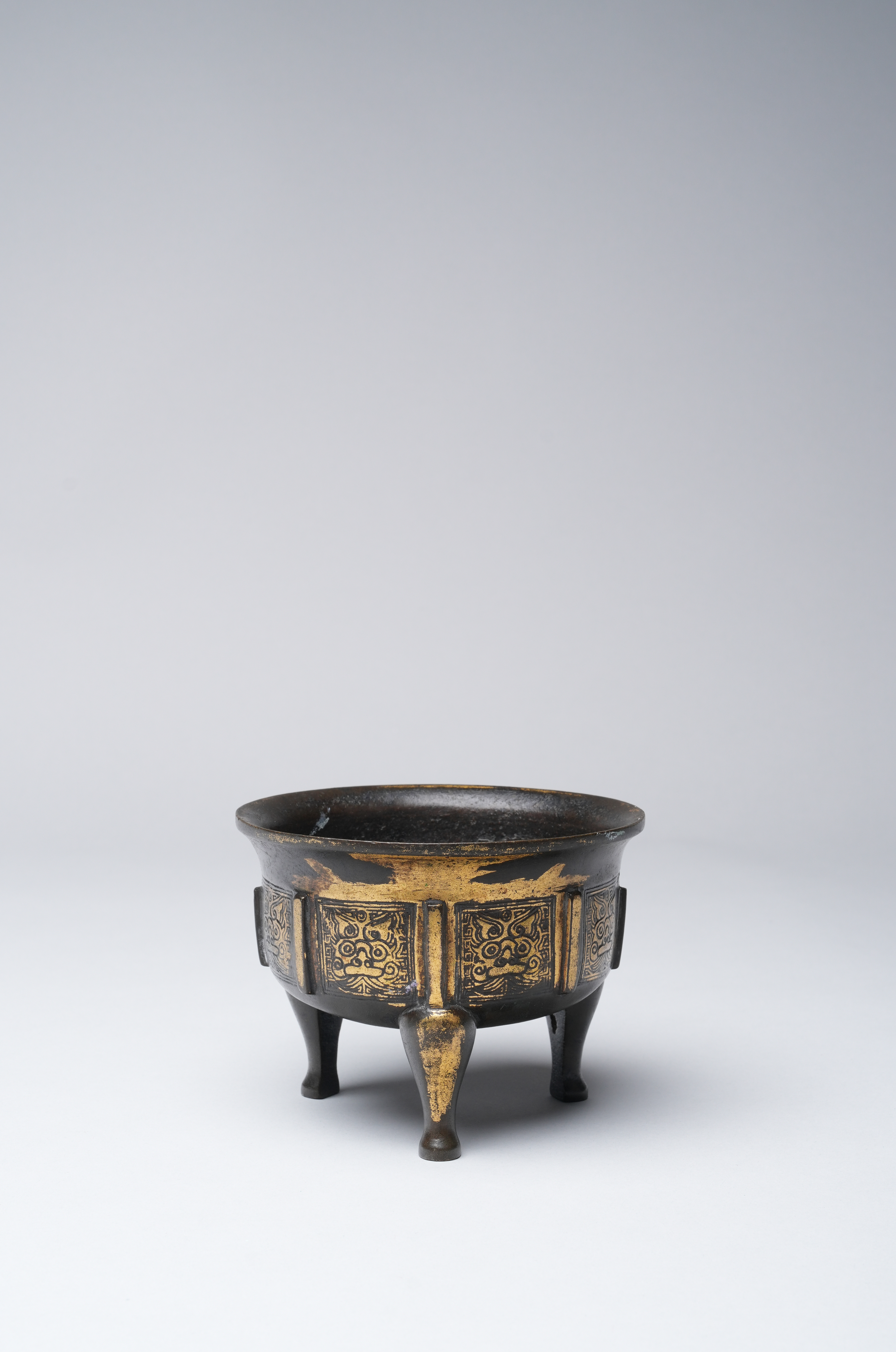 A CHINESE PARCEL-GILT BRONZE TRIPOD INCENSE BURNER