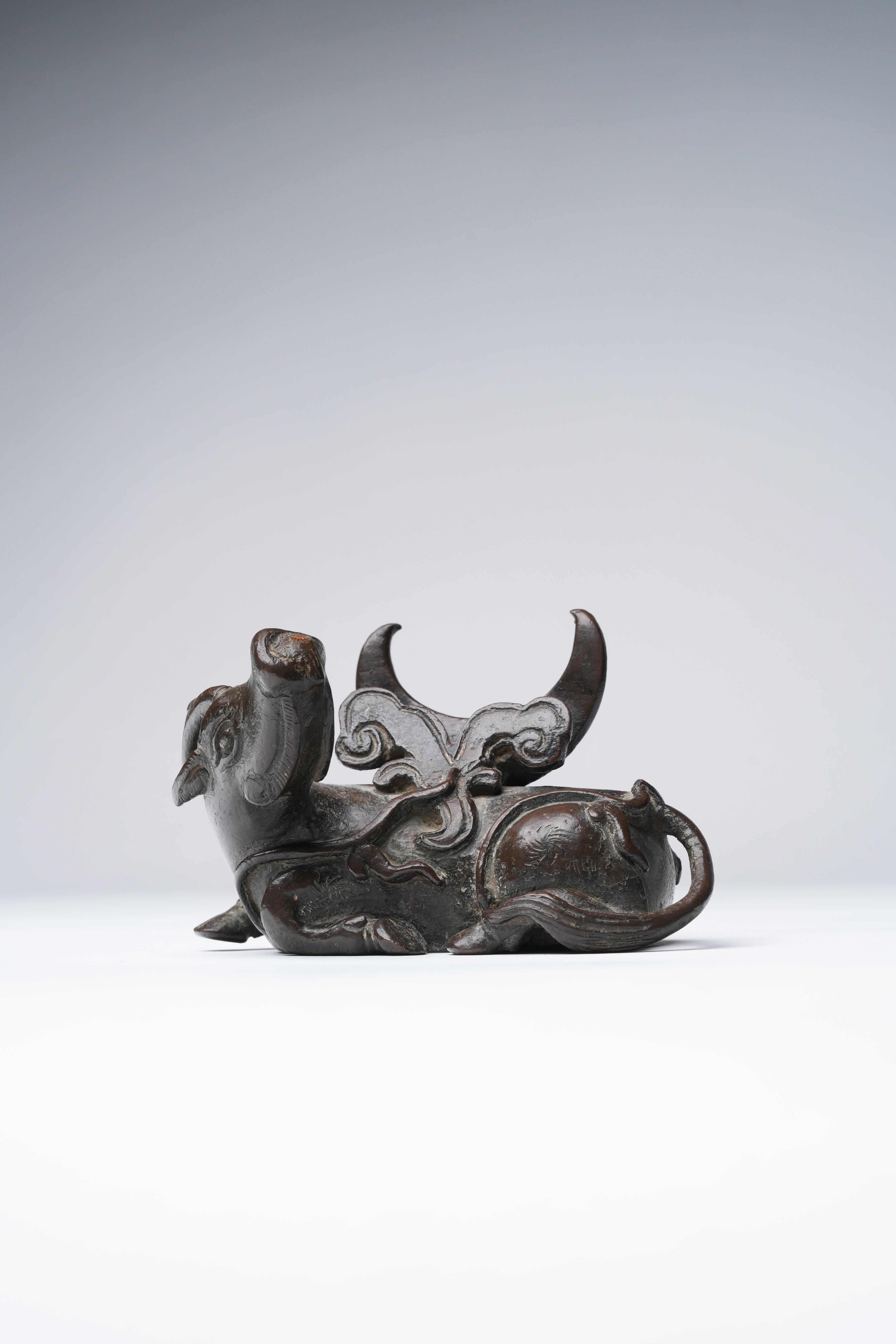 The recumbent horned beast with its head raised and turned to the rear, bearing a crescent-form receptacle on its back, with a scrolling cloud panel to the front, with a paper label for the Finer Collection 'CB 51', 398g, 11cm.