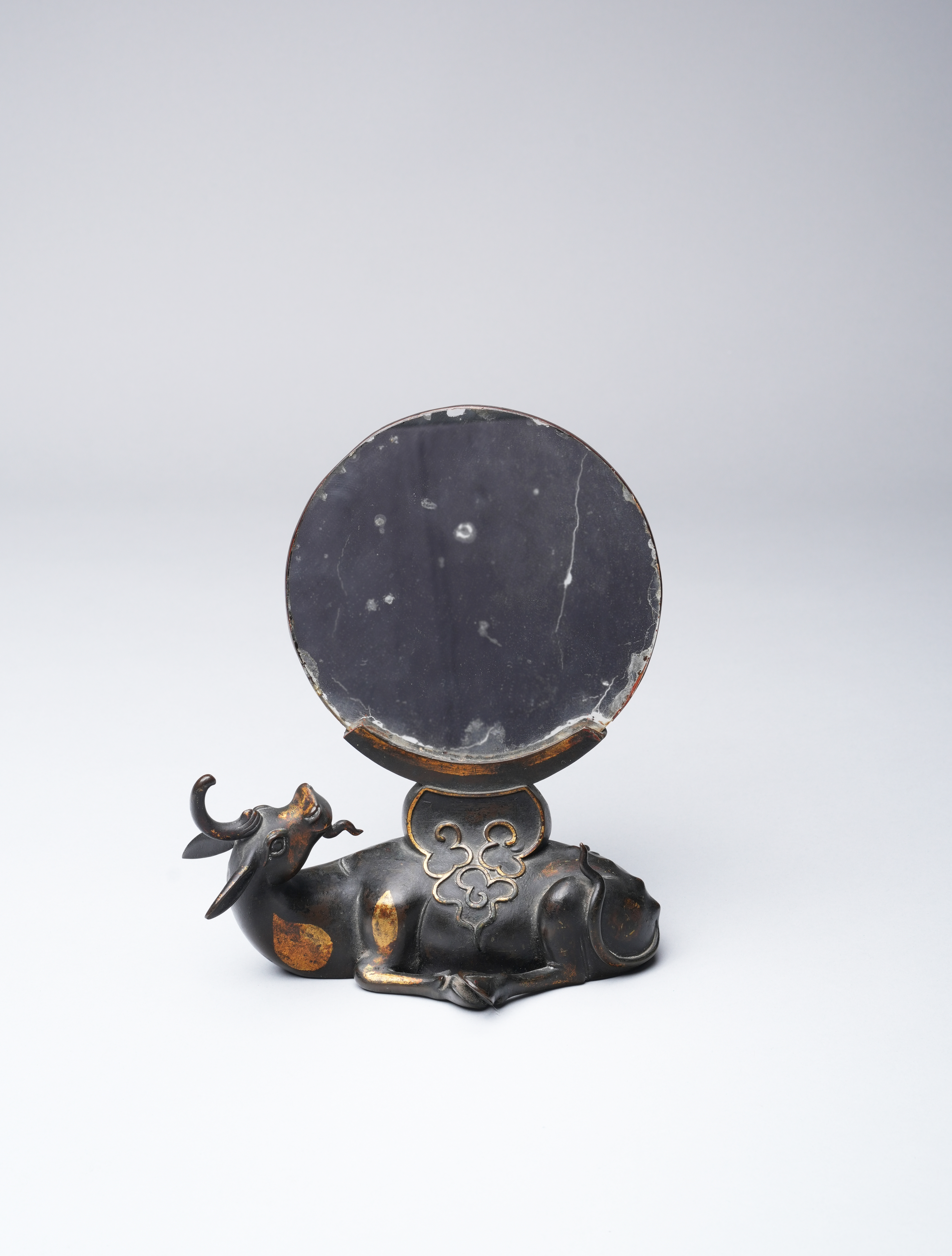 The recumbent horned beast with its head raised and turned to the rear, bearing a crescent-form receptacle on its back, with a scrolling cloud panel to the front, mounted with a later circular mirror, with a paper label for the Finer Collection 'CB 14', 721g, 16 cm.