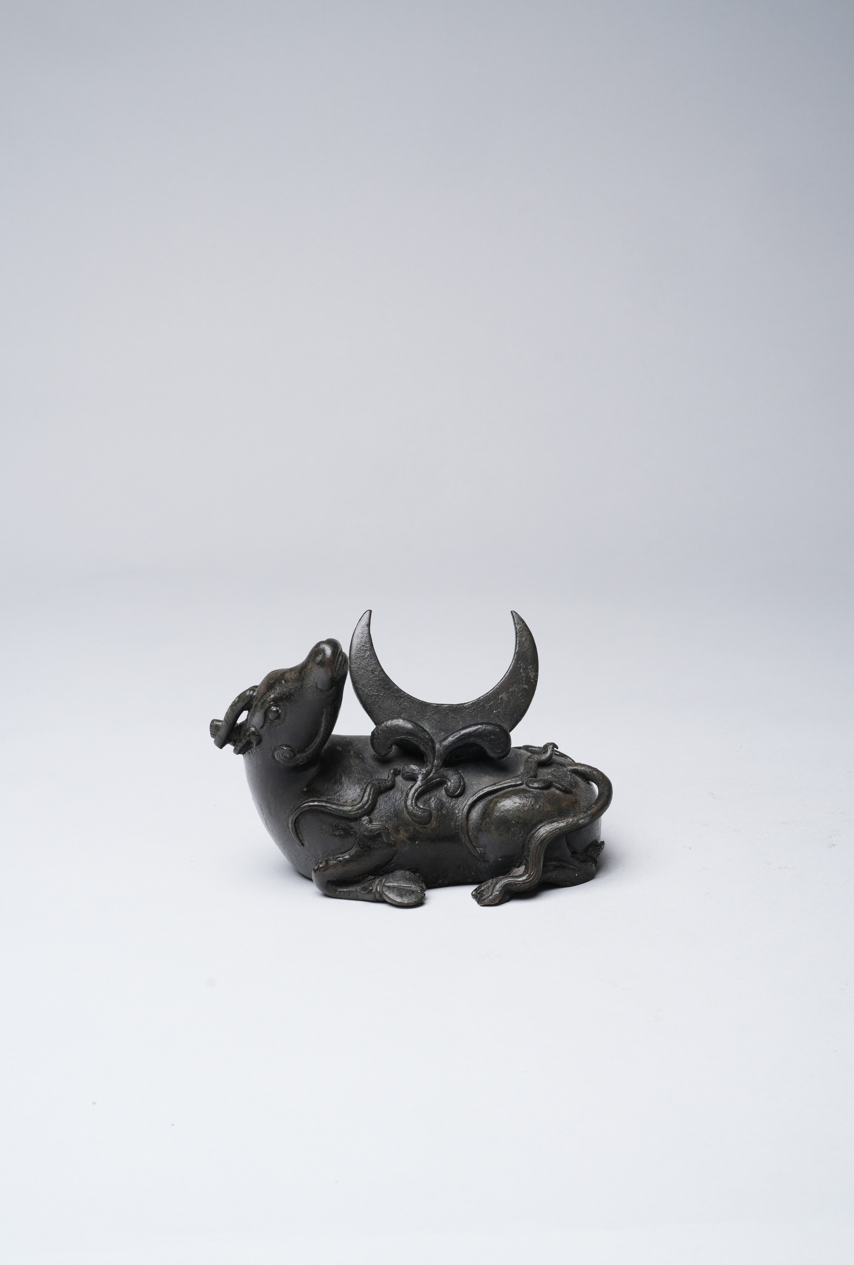 The recumbent horned beast with its head raised and turned to the rear, bearing a crescent-form receptacle on its back, with a scrolling cloud panel to the front, with a paper label for the Finer Collection 'CB 109', 831g, 16.5cm.