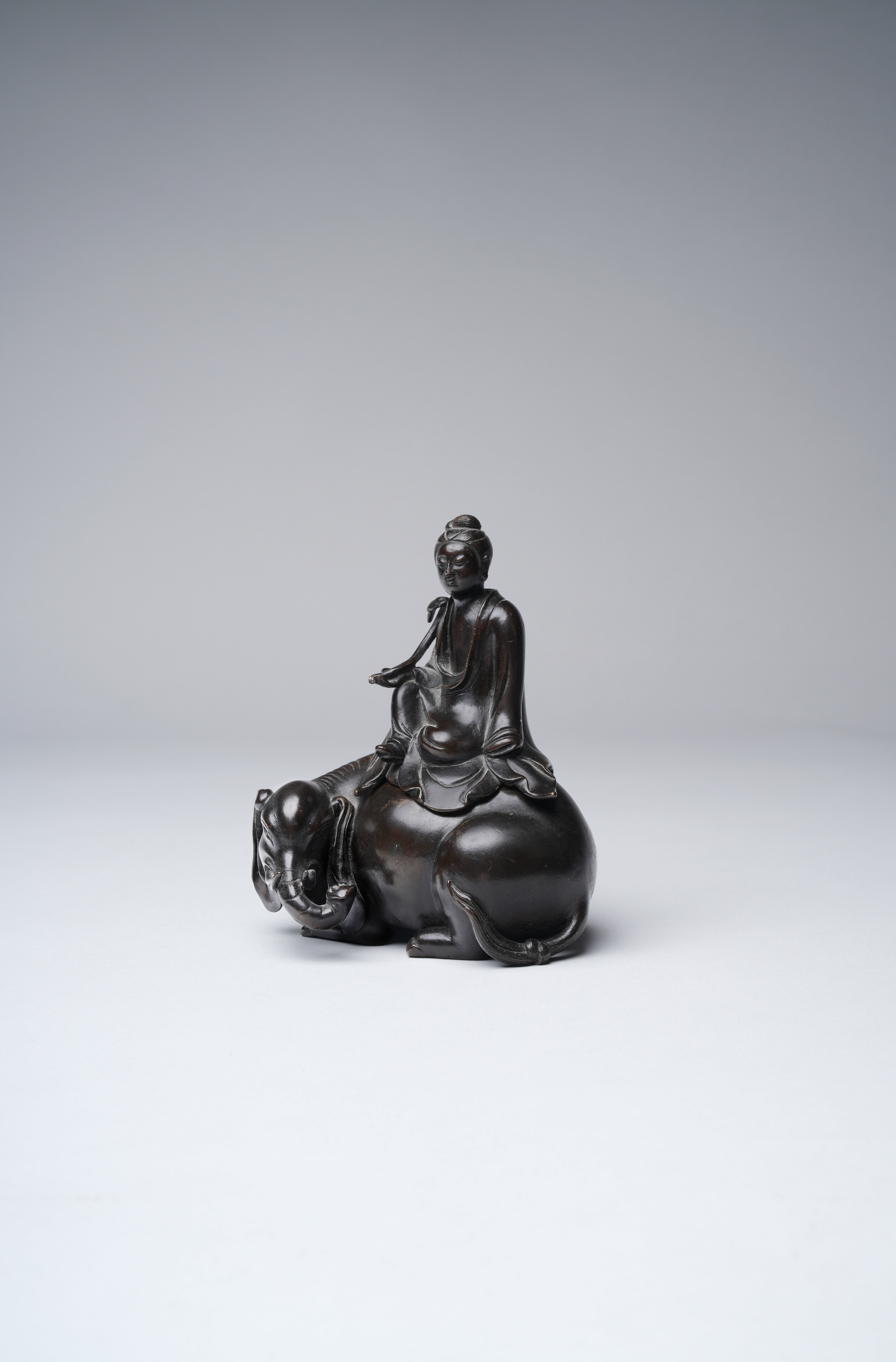 Modelled as a recumbent elephant, the cover formed as a figure of the Goddess of Mercy, the reverse with a heart-shaped hole, with a paper label for the Finer Collection 'CB 64', 941g, 15.5cm. (2)