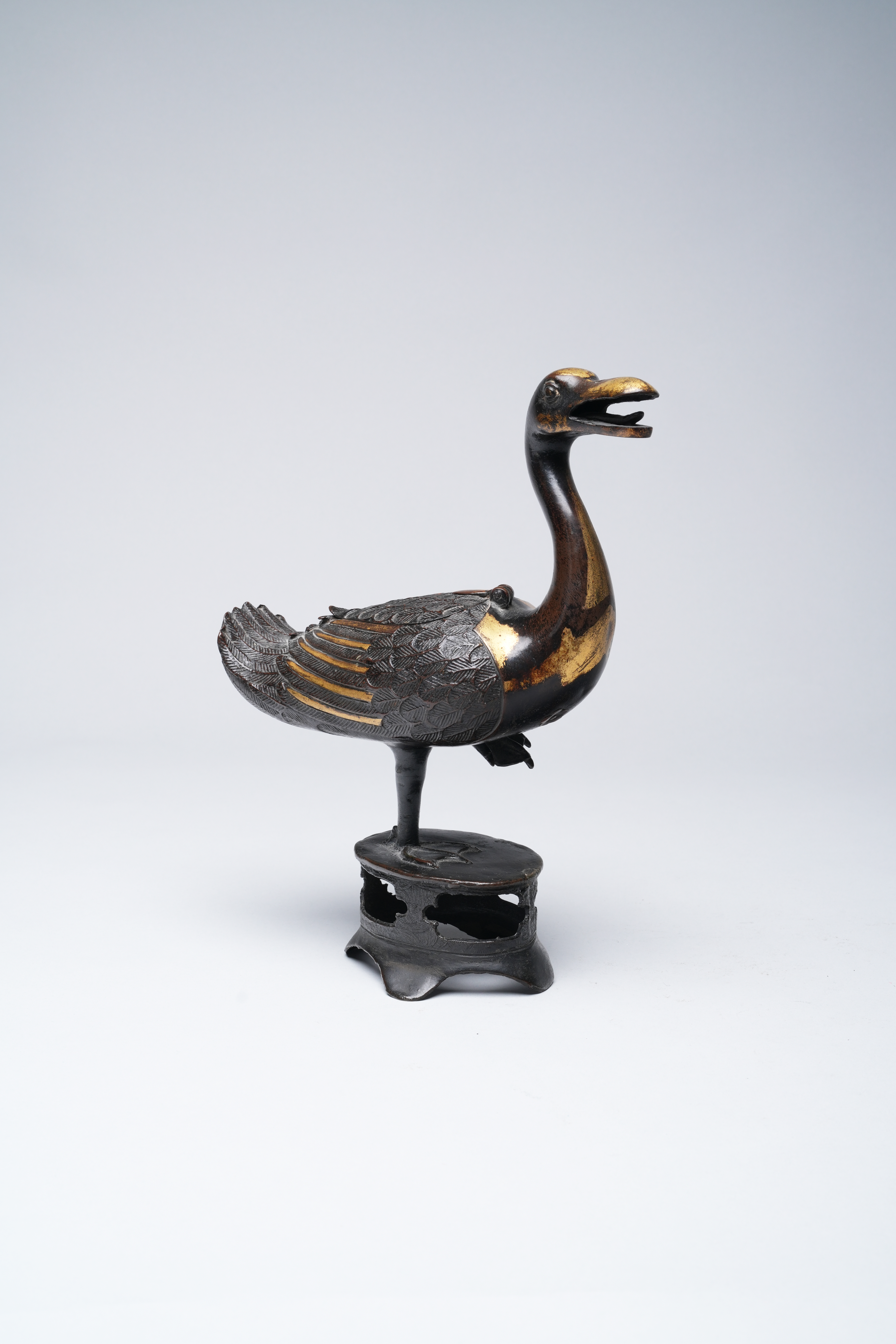 A CHINESE PARCEL-GILT BRONZE 'DUCK' INCENSE BURNER