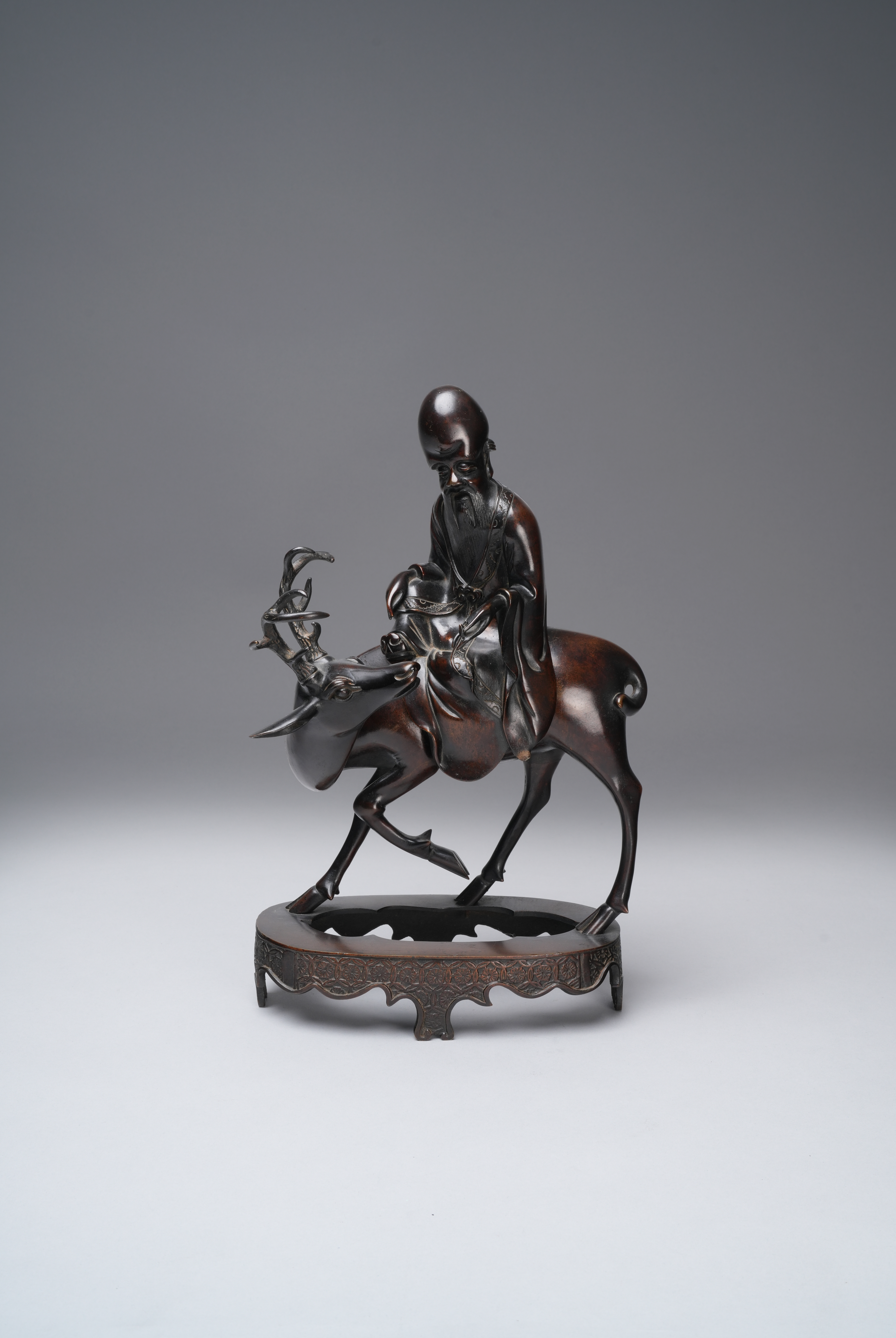 Cast in two sections, the God of Longevity wearing flowing robes, seated upon a deer with its head turned back and its front leg left, with an associated stand, with a paper label for the Finer Collection 'CB 48', 4kg, 37.5cm. (2)