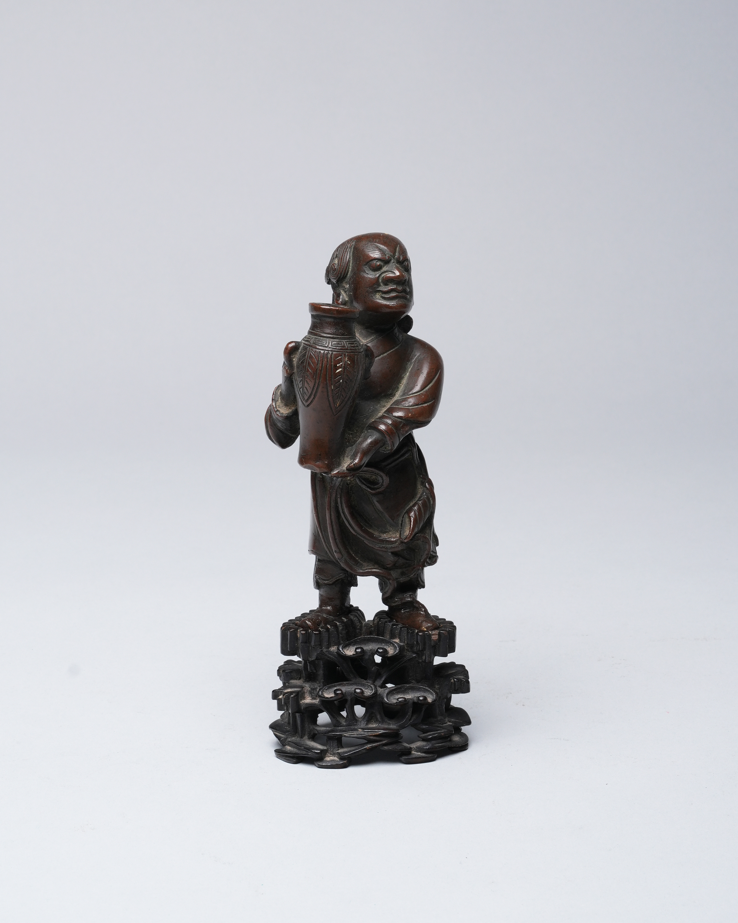 The figure wearing loose robes and holding a two-handled vase, with a wood stand, with a paper label for the Finer Collection 'CB 108', 1kg, 15cm. (2)