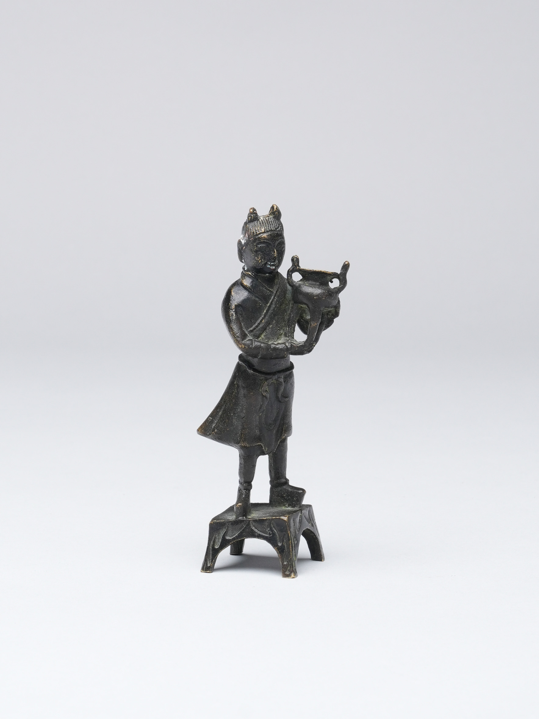 Standing holding an incense burner and raised on a flared base, with a paper label for the Finer Collection 'CB 101', 181g, 11cm.