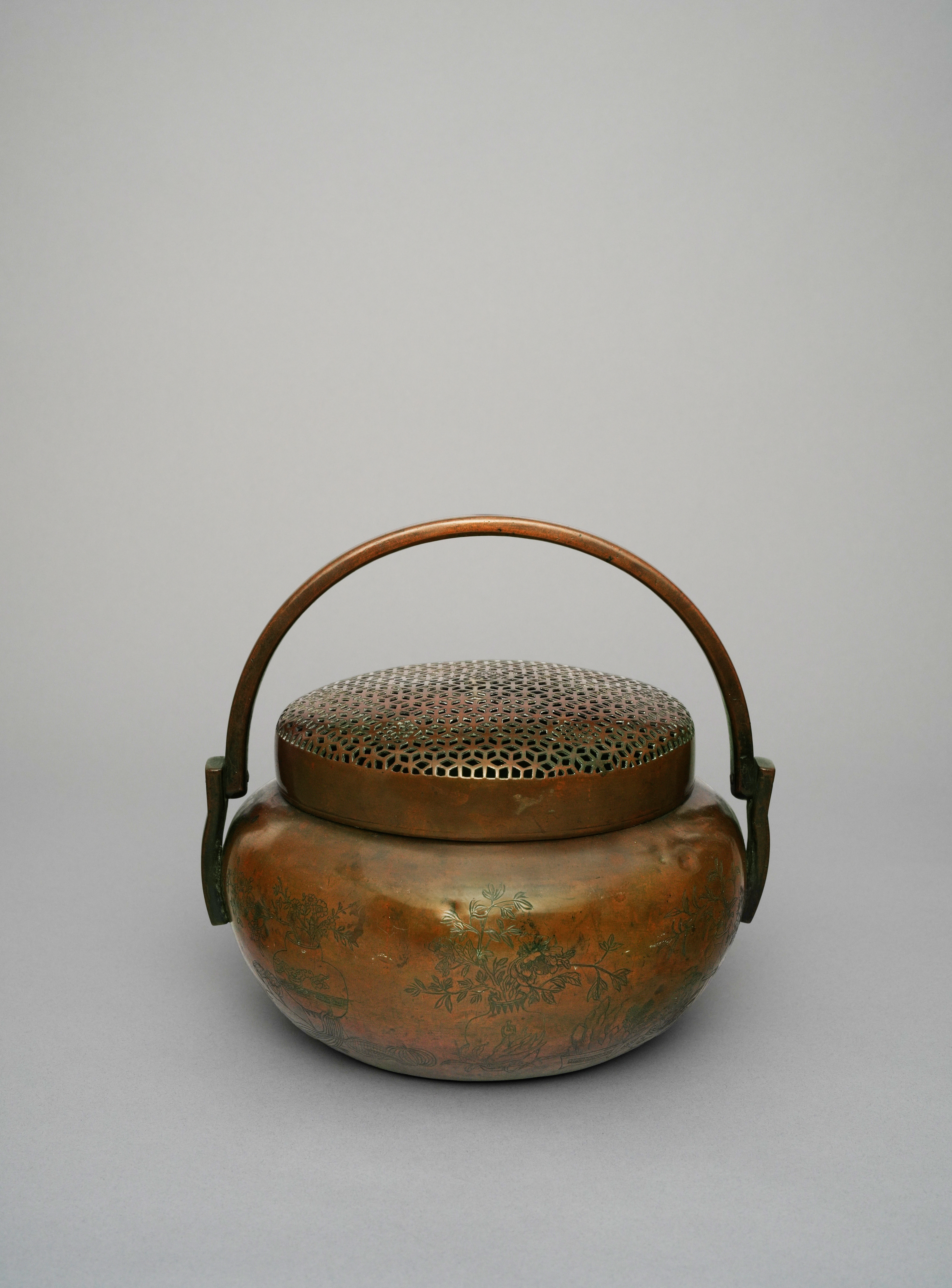 The body incised to one side with the flowers of the Four Seasons including peony, prunus, lotus and bamboo issuing from rockwork, and set with a swing handle, the pierced cover with a geometric lattice design, with a paper label for the Finer Collection 'HW 6', 2.3kg, 28cm. (2)