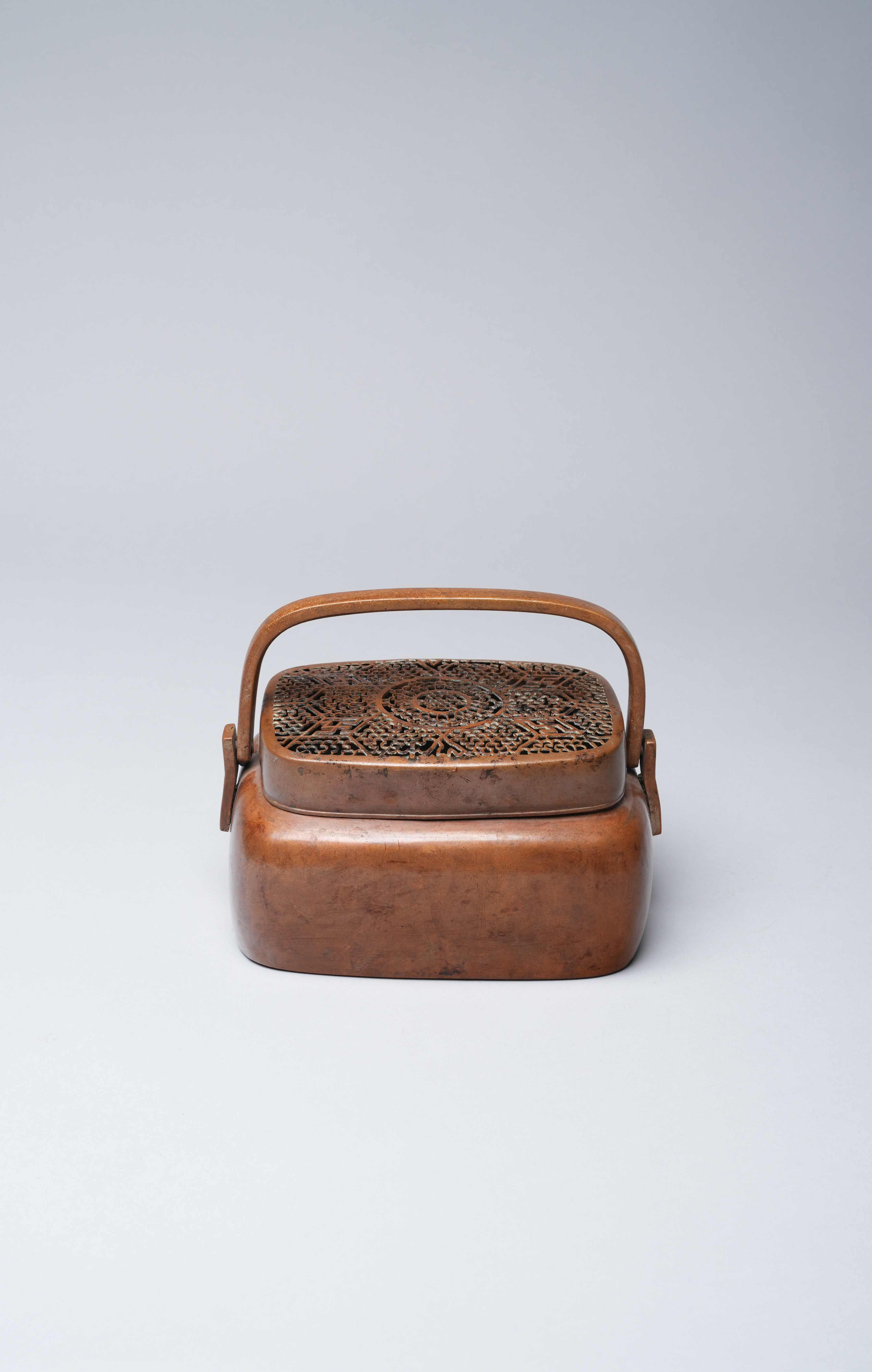 The plain rectangular body set with swing handle, the cover pierced with floral and geometric designs, with a two-character mark reading Mingqi, with a paper label for the Finer Collection 'HW 30', 1.3kg, 20cm. (2)