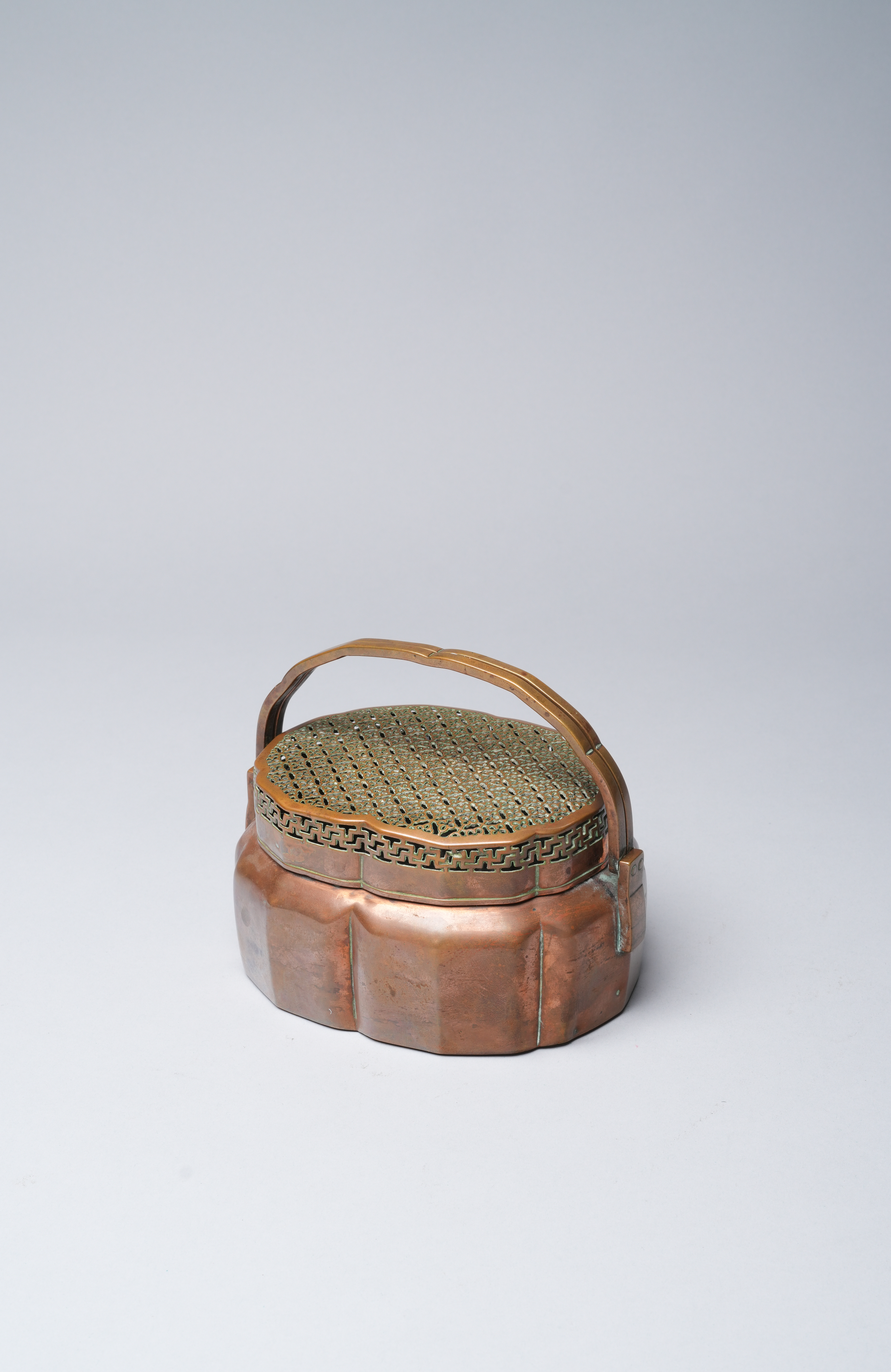 A CHINESE COPPER ALLOY LOBED HAND WARMER AND COVER