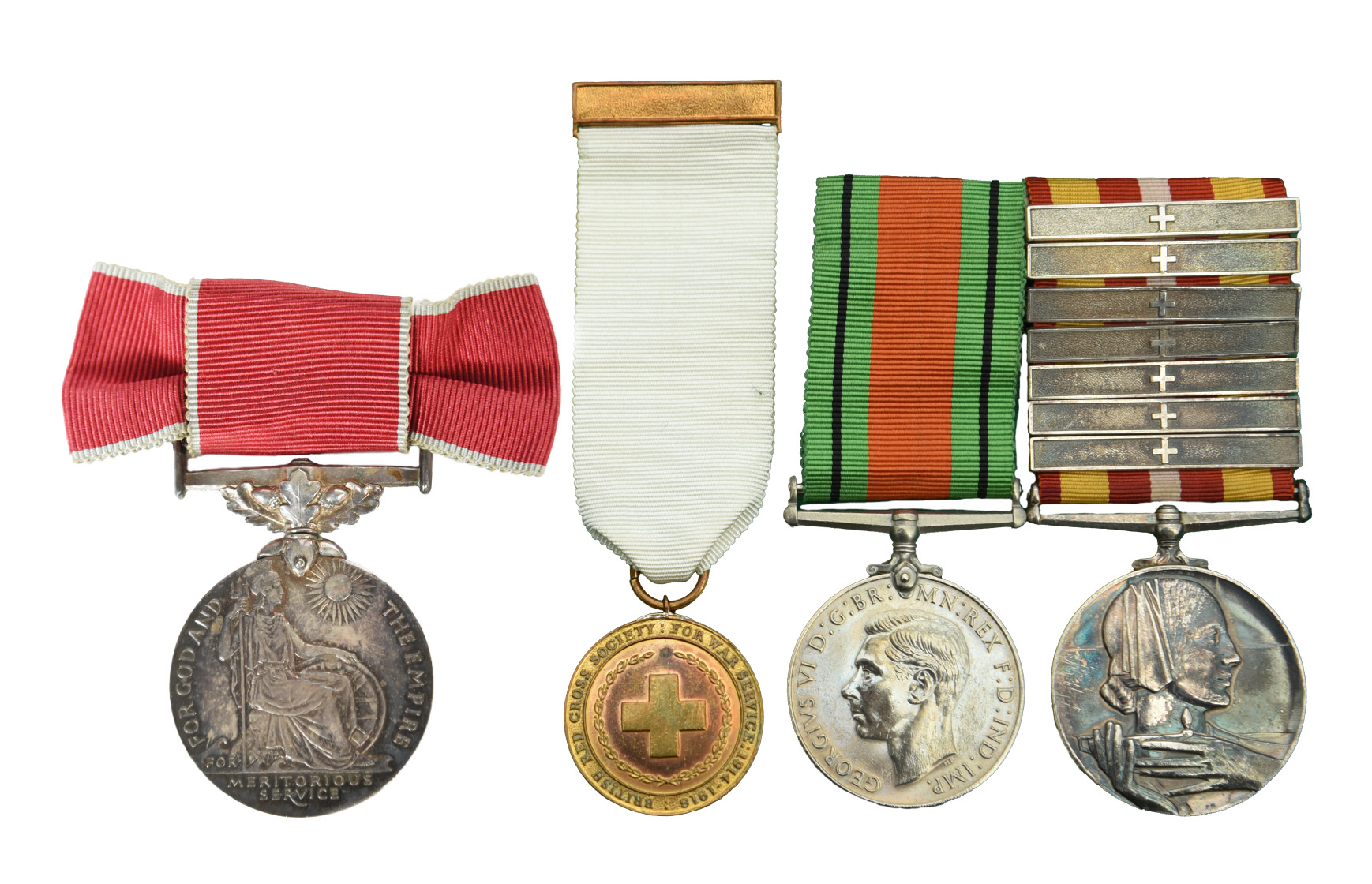 A B.E.M. group of medals and insignia to Edith Violet Moutrie, British Red Cross: Medal of the Order of the British Empire for Meritorious Service (British Empire Medal), Elizabeth II (EDITH VIOLET MRS MOUTRIE) with its bow ribbon and pin fitting, in case of issue, appears officially re-named, nearly extremely fine and toned; British Red Cross Society Medal for War Service, wear to gilding, otherwise very fine; Defence Medal, contact marks to truncation, otherwise very fine; Voluntary Medical Service Medal, silver, with seven B.R.C.S. bars (EDITH V. MOUTRIE.), [4]; together with a B.R.C.S. Proficiency Badge with 1915 bar (760 EDITH HAYWARD), various other B.R.C.S. badges; badges for the Women's Institute, the Primrose League, the National Hospital Service Reserve, the Women's Voluntary Service, and other organisations, a White Star Line badge, others; and a quantity of certificates, photographs and other ephemera. [qty]