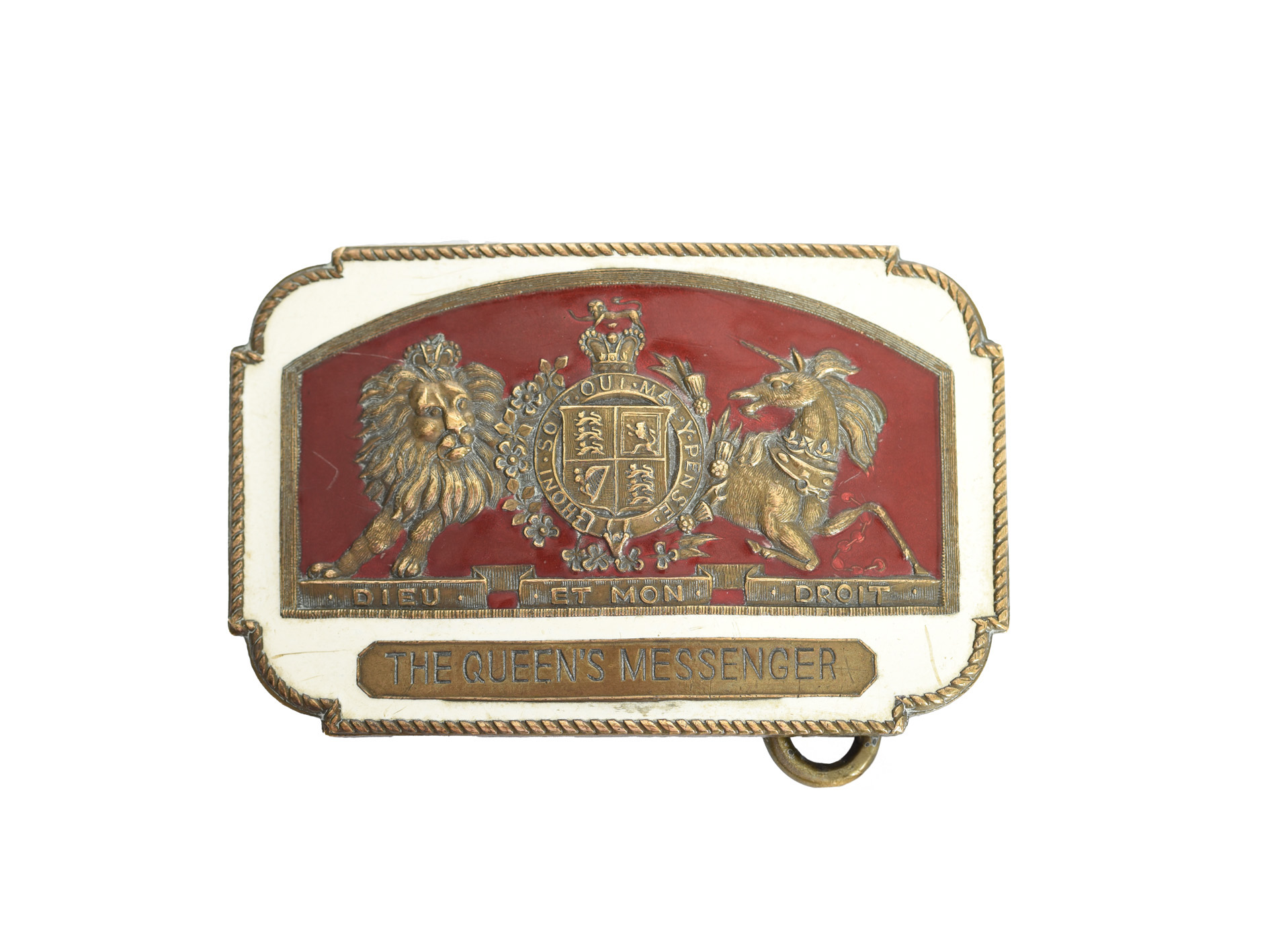 A rare and possibly unique Queen's Messenger's belt buckle made in the American manner, Victoria or Elizabeth II, brass and enamel, a slightly convex rectangular plate with stepped and radiused corners, the Royal Arms in fine relief to a red enamel ground within an arched panel, 'THE QUEEN'S MESSENGER' to a brass plate below, all against a general ground of cream enamel and within a roped border, impressed mark of the Bay State Jewelry and Silversmiths Co to the reverse incorporating 'Patent no 104,012', and 'Serial No 82010', brass loop fitting with embossed eagle and 'WARRANTED FINEST MINTED BRASS' to one end of the reverse and a small hook to the other, width 95 mm, minor blemishes to the enamel, good very fine.