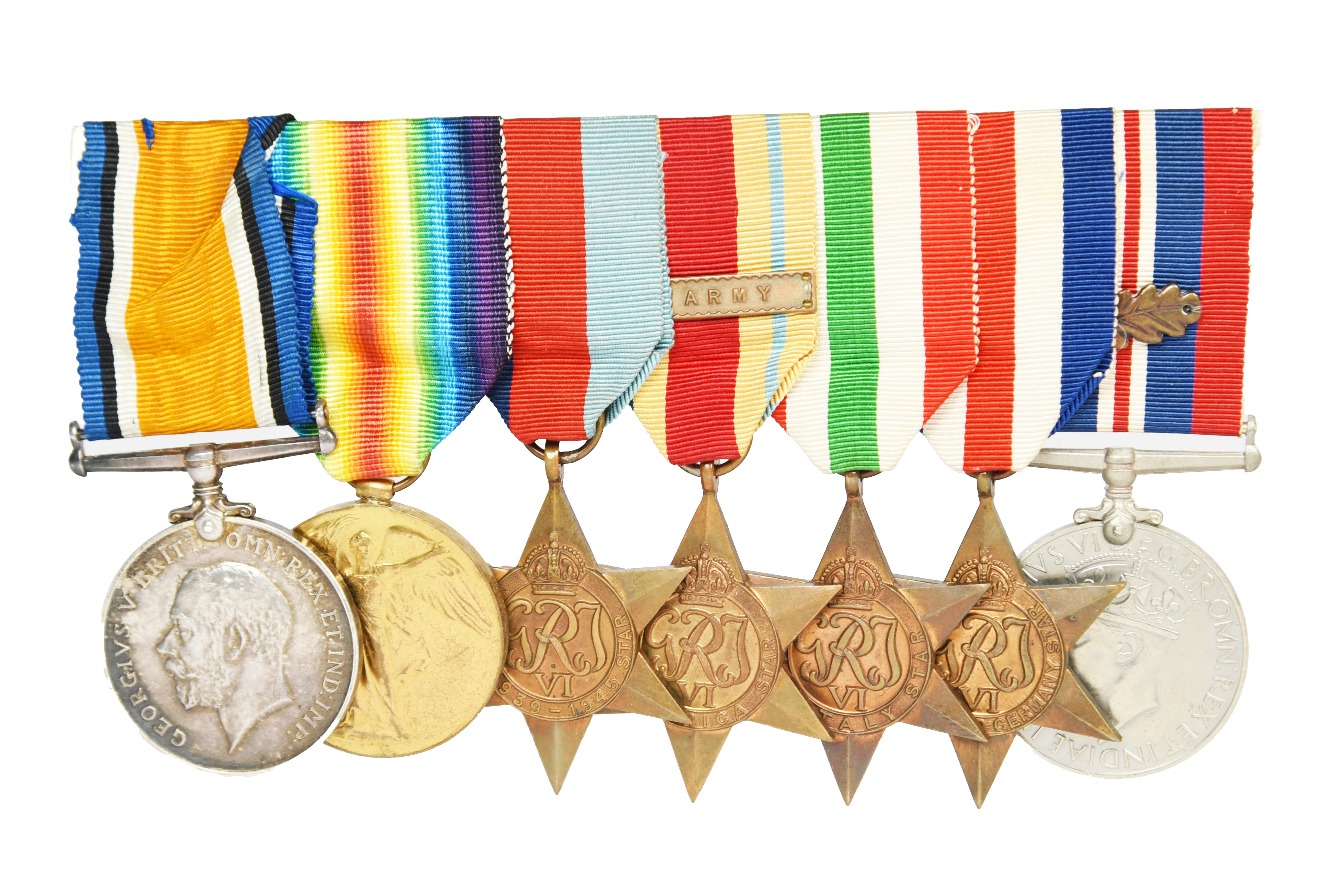 Seven medals named or attributable to Major William J. Stiff, Royal Engineers late 7th Hussars: British War Medal 1914-20 and Victory Medal (288850 PTE. W. J. STIFF. 7-HRS.), 1939-45 Star, Africa Star with 8th Army clasp, Italy Star, France and Germany Star, War Medal 1939-45 with Mention in Despatches emblem, mounted for wearing, very fine and better. [7]