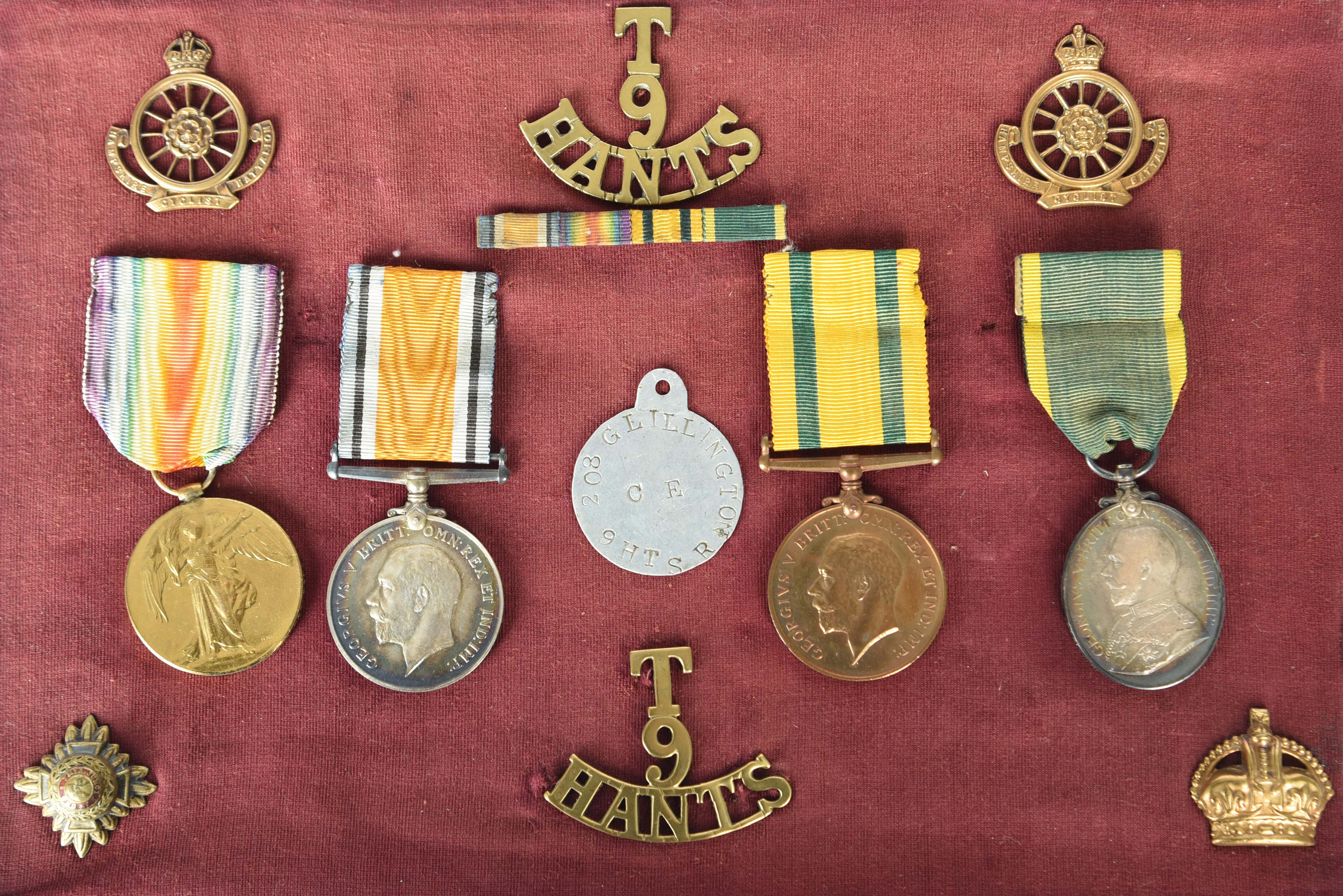 A Siberian Intervention group of four medals to Sergeant George Robert Lillington, Hampshire Regiment: British War Medal 1914-20 and Victory Medal (355102 SJT. G. R. LILLINGTON. HAMPS. R.); Territorial Force War Medal (208 PTE. G. R. LILLINGTON. HAMPS. R.); Territorial Force Efficiency Medal, George V (355102 SJT G. R. LILLINGTON. 9/HAMPS: R.), extremely fine or better, the silver medals toned, [4]; framed with a small quantity of 9th Battalion Hampshire Regiment insignia.