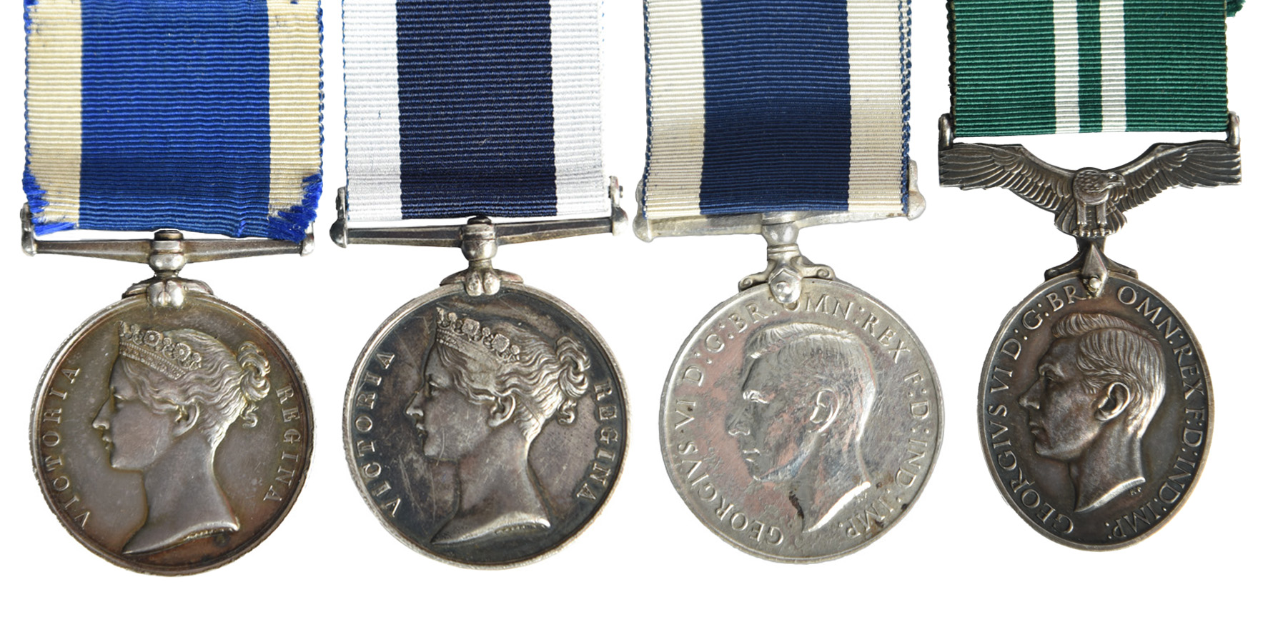 A small collection of long service awards, comprising: a Royal Navy Long Service and Good Conduct Medal, Victoria, narrow suspender (CHAS. PETTY, LDG. SEA., H.M.S. VICTORY.), impressed, nearly extremely fine with some toning and lustre; another (WILLM. READ [?] LG. STOKER H.M.S. NORTHAMPTON), impressed, naming partially erased and edge heavily abraided, otherwise very fine; another R.N. L.S.G.C., George VI, Ind: Imp. (M. 38674 P. W. PEPPER. S. B. P. O. H.M.S. REVENGE.), re-impressed on an erased edge, heavy pitting, fine only; and an Air Efficiency Award, George VI, Ind: Imp: (740602. SGT. D. R. HOBBS. R.A.F.V.R. ), extremely fine and toned. [4]