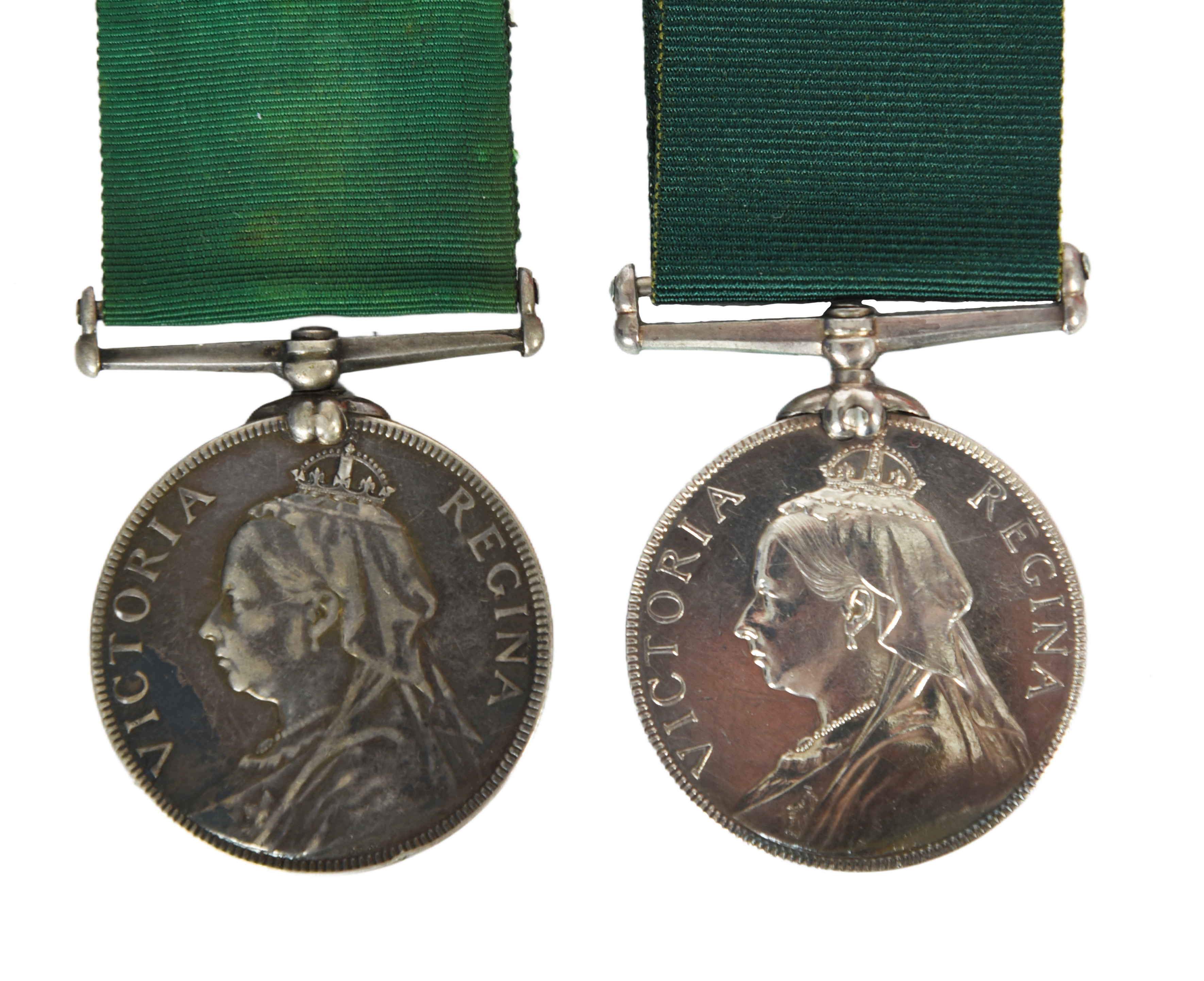 Volunteer Force Long Service Medals (2): i) Victoria (No549 QR MASTER SERGT W. MANSELL, 4TH V.B. EAST SURREY REGT), engraved in serif capitals, about very fine; ii) Victoria (2099 PTE J. MCMAGNESS. 4TH V.B. E. SURREY REGT.), impressed in plain capitals, smoothing to bust and reverse text, fine. [2]