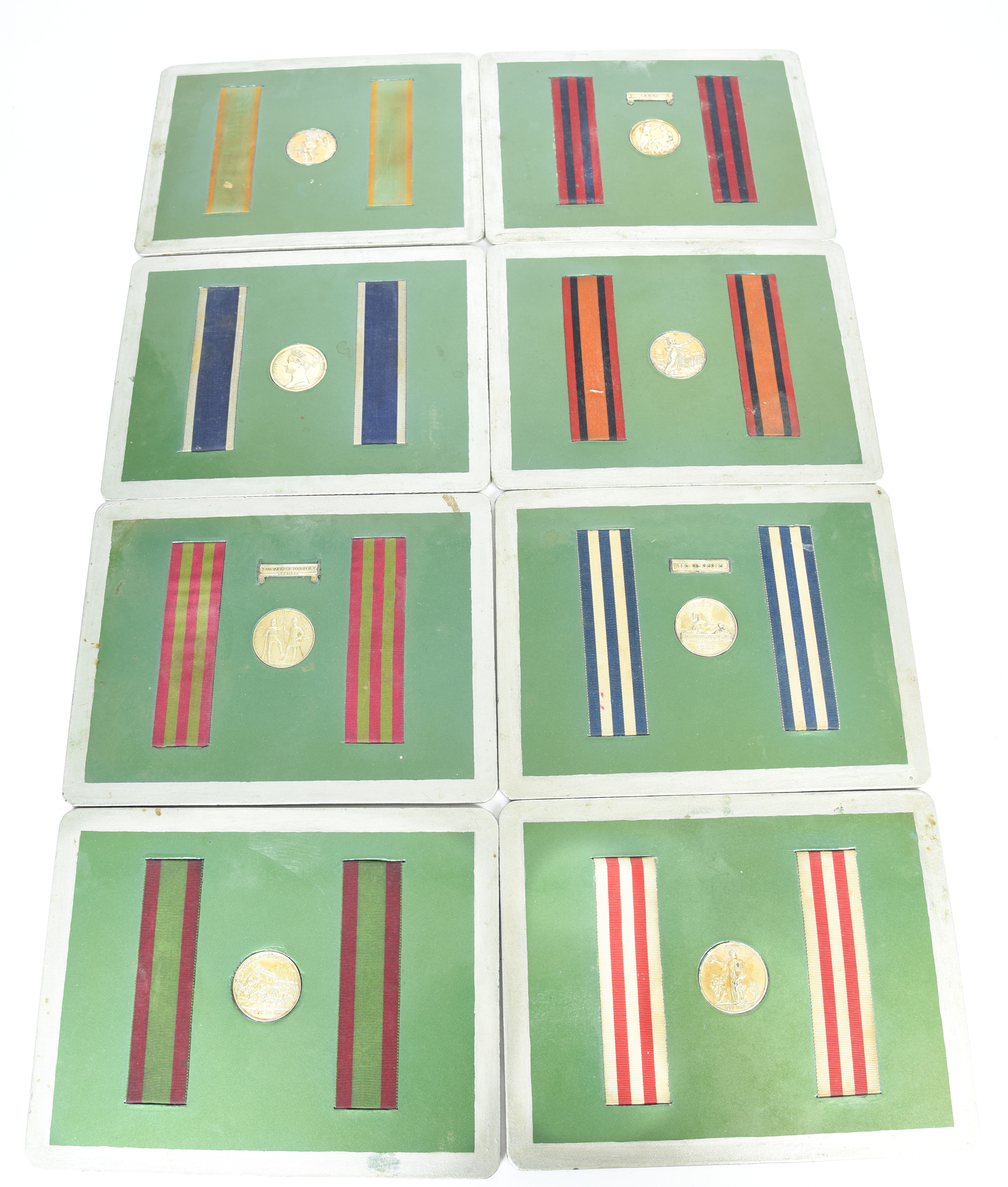 Eight Victorian medals, detached from their suspensions and set into table mats with the reverses