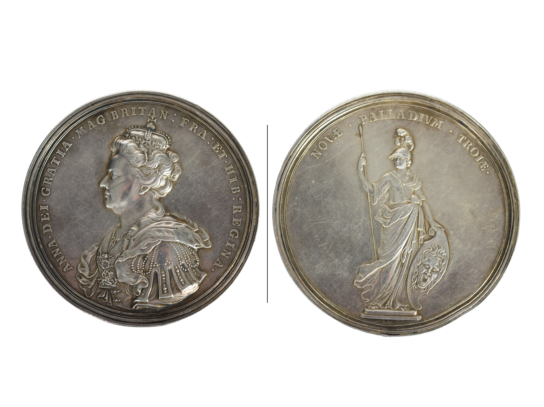 Anne, Union of England and Scotland 1707, a silver medal by J. Croker, crowned and draped bust left, rev. a statue of Anne as Pallas, NOVÆ. PALLADIUM. TROIÆ, in a shagreen-covered case, 70 mm (E 423), rim dent involving pitting at 7 o'clock. otherwise very fine or better, case warped and worn.