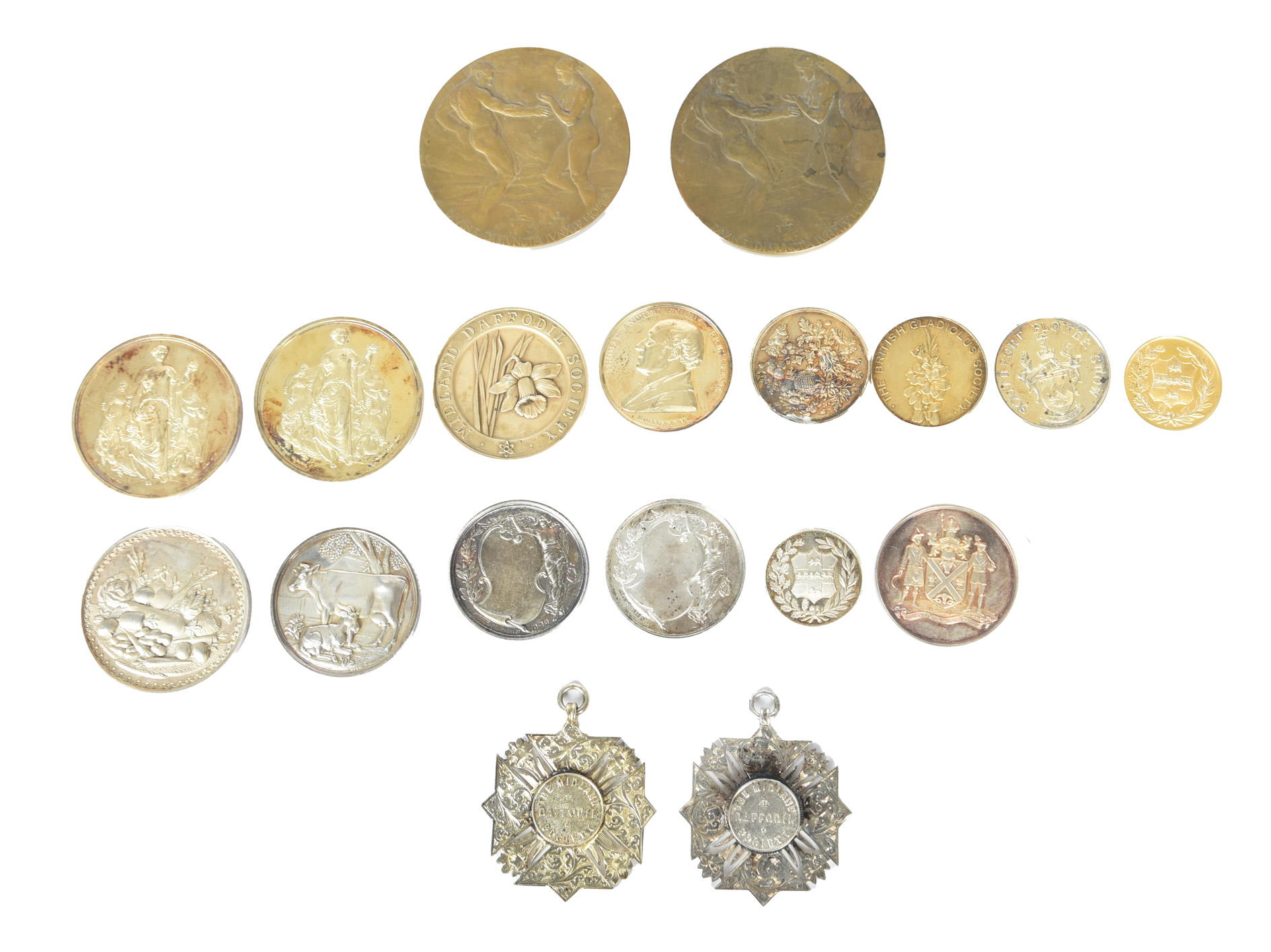 Sutton Seeds: a collection of agricultural and horticultural prize medals awarded to the famous Reading seed company, including: National Chrysanthemum Society, ''Collection of Vegetables...Nov. 12. 1889", gilt, 39 mm; Deeping St Nicholas District Agricultural Society, "1895...Prize Winner Mangel", silver, 54 mm, cased; The Grand Yorkshire Gala, 1895, gilt, 32 mm; the same, undated, "for a collection of vegetables", silver, 32 mm; The British Dairy Farmers' Association, "Awarded to Martin J. Sutton, for Red Polled Bull "Bockmer King", Dairy Show 1906", silver, 48 mm, edge impressed with award details, cased; Norfolk and Northwick Horticultural Society, 1907, silver, 45 mm, Birmingham hallmark; The Midland Daffodil Society (2), "Display of Cinerarias",1910 and 1911, silver, elaborate cruciforms with suspension loops, 55 mm; Midland Daffodil Society, "Flowers and Vegetables", 1913, silver, 51 mm; Aberdeen Show, "For Sweet Peas", 1935, silver, 44 mm, cased; and various others including unnamed specimens of he Royal Horticultural Society's medals and continental bronze examples, mainly high grades, award details engraved unless otherwse stated. [qty]