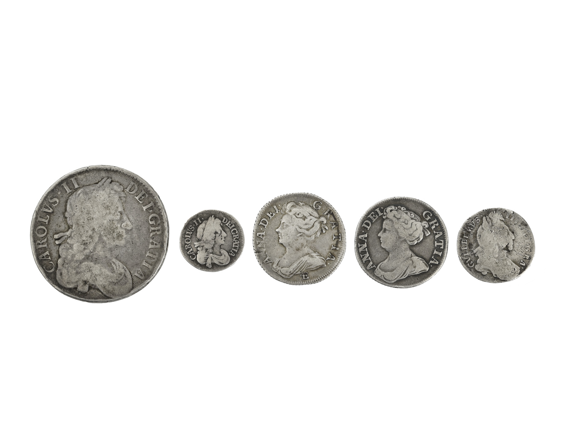 A small quantity of late Stuart silver coins, comprising: Charles II, crown, 1681, fouth bust, edge T. TERTIO (S 3359), fine or nearly so; threepence, 1679 (S 3386), fine; Anne, shilling, 1707, Edinburgh, E under bust (S 3608), good fine; shilling, 1711, fouth bust, r. plain angles (S 3618), fine; together with a sixpence of William III, rubbed and buckled, date indistinct. [5]