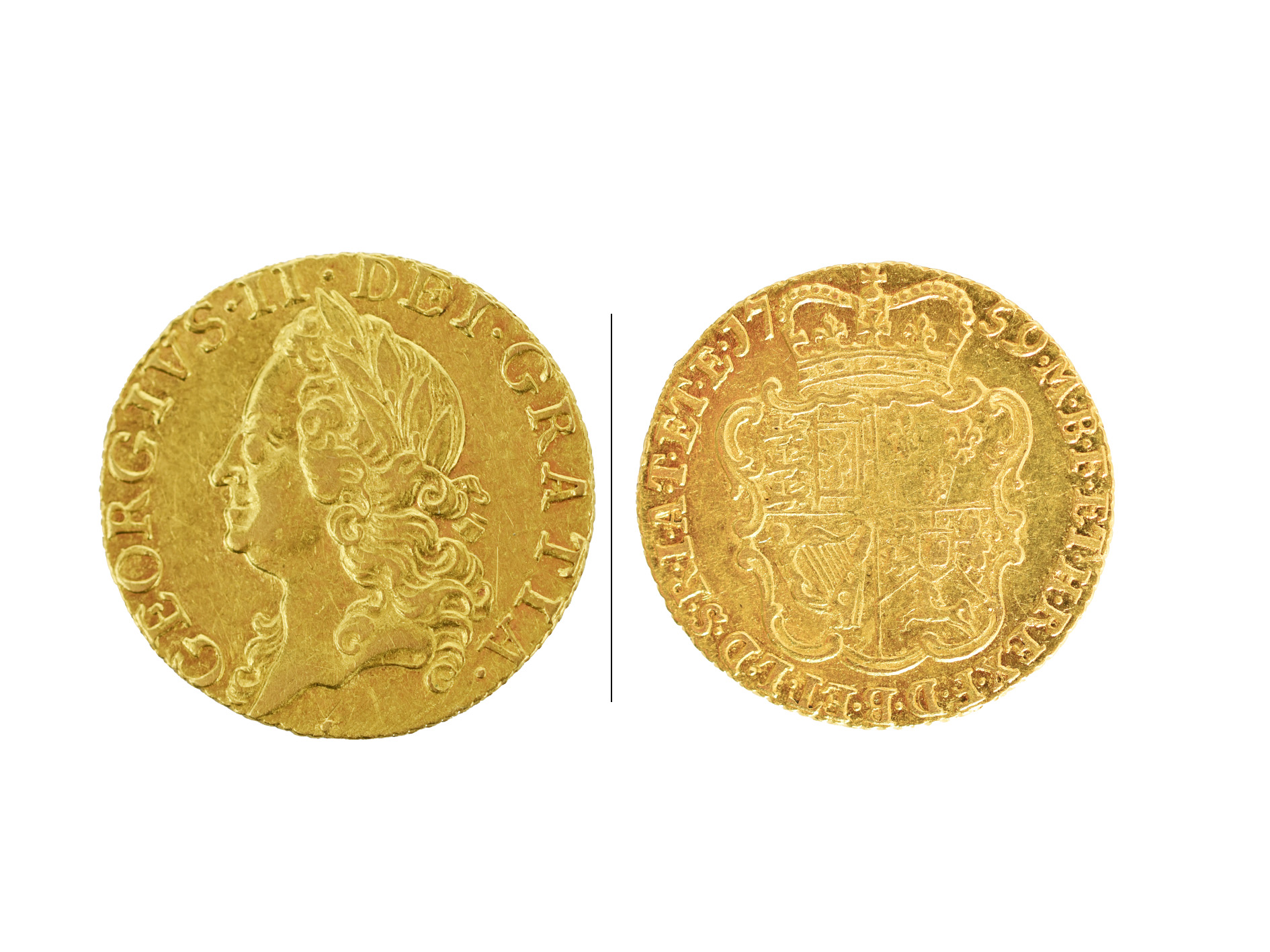 George II, gold half-guinea, 1759, old head, rev. shield of arms (S 3685), centre reverse a little rubbed, otherwise very fine or better.