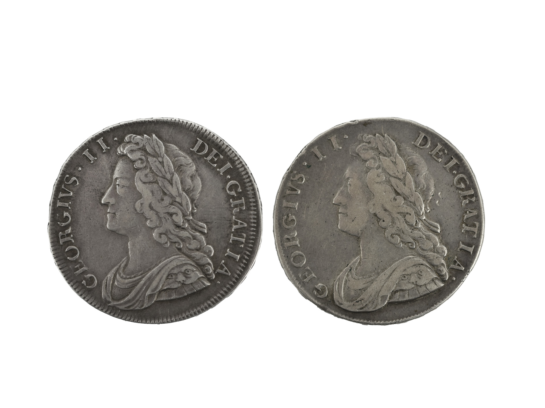 George II, silver halfcrowns (2), 1731, young bust, rev. roses and plumes, edge QVINTO, good fine or better; 1736, edge NONO, fine or a little better (S 3692). [2]