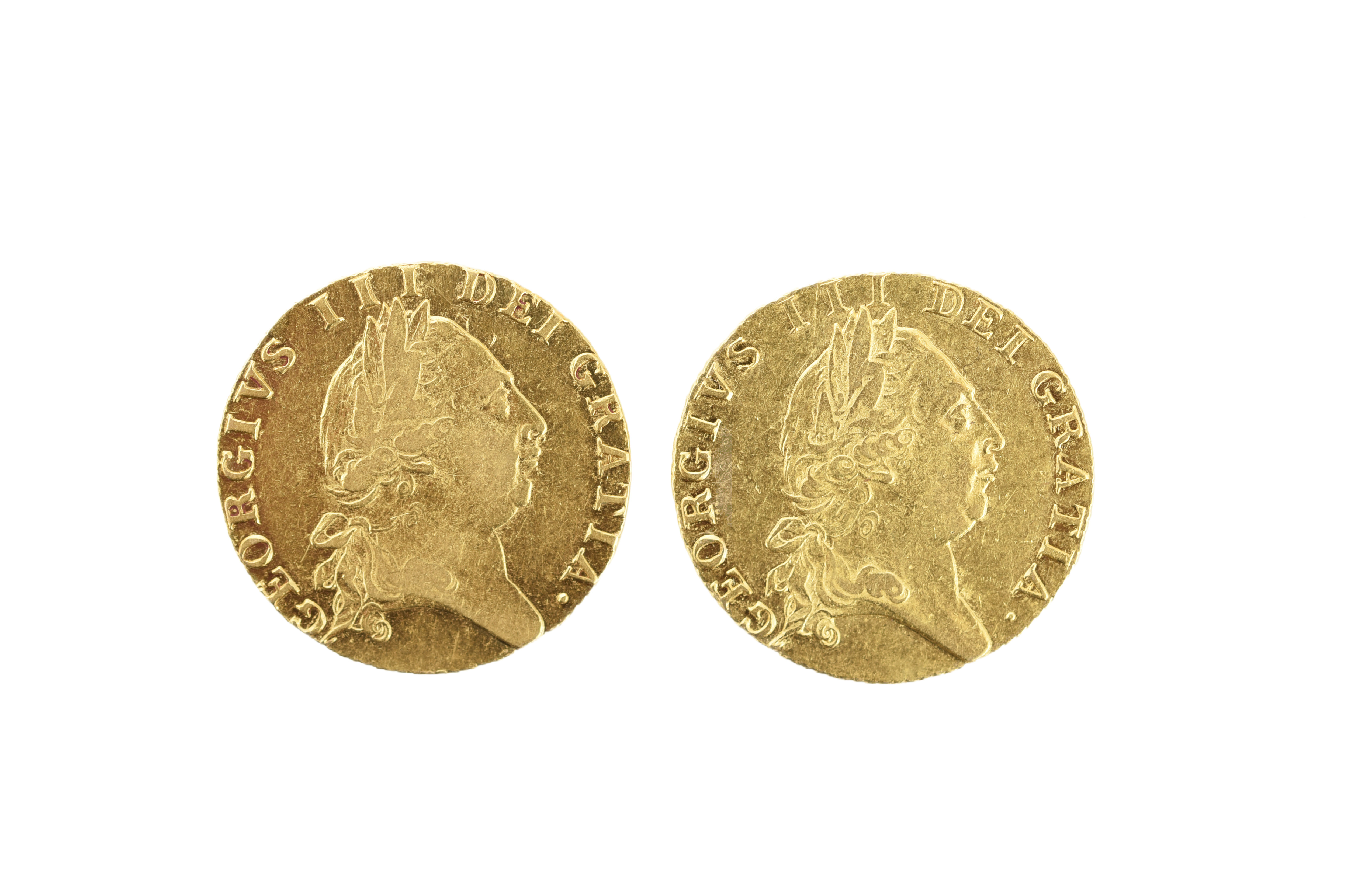 George III, gold guineas (2), 1789 and 1790, fifth head, rev. spade-shaped shield (S 3729), very fine and good very fine. [2]