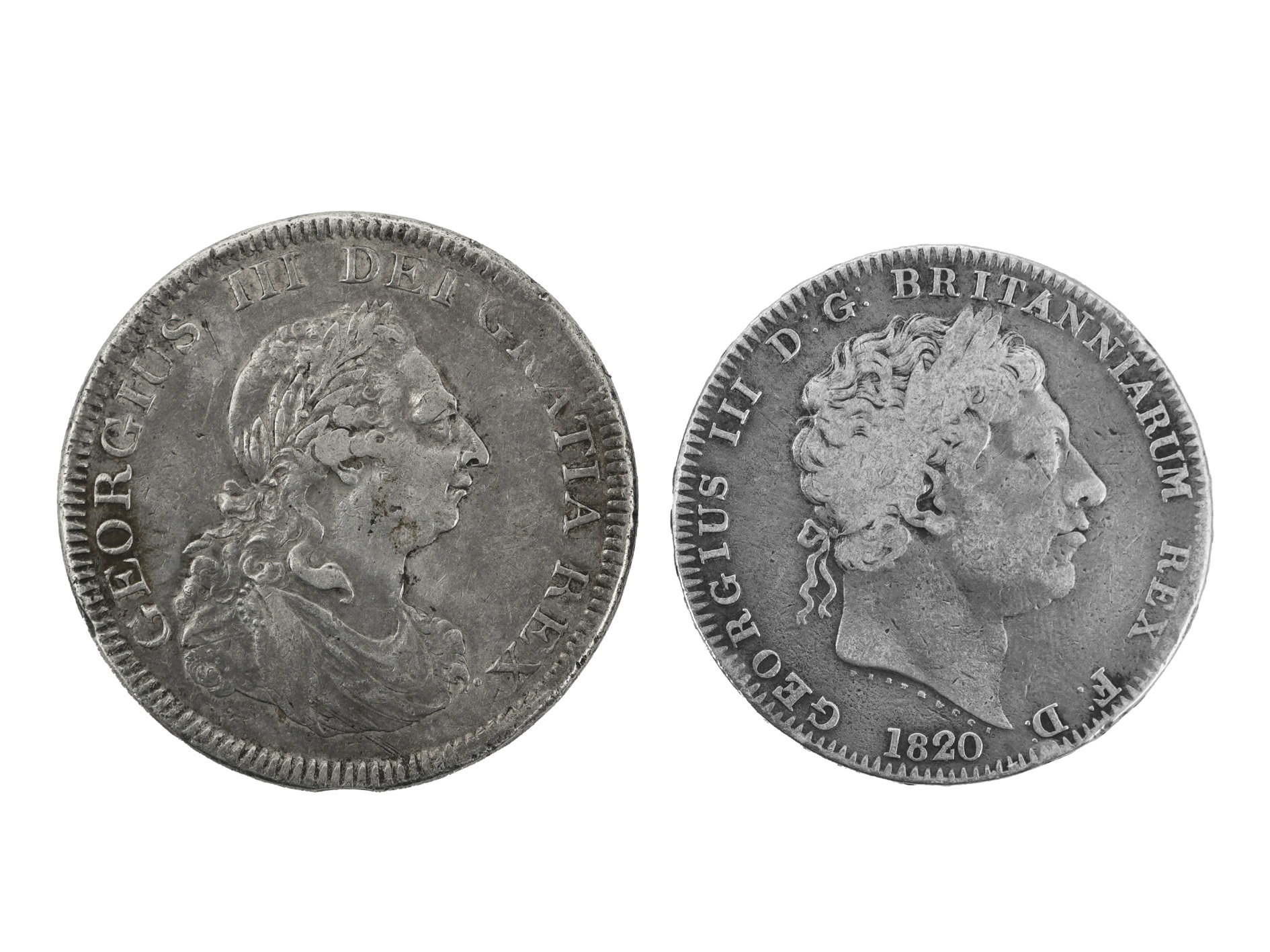 George III, silver dollar, 1804, Bank of England Issue (S 3768), fine or better; and silver crown, 1820, new coinage, edge LX (S 3787), fine. [2]