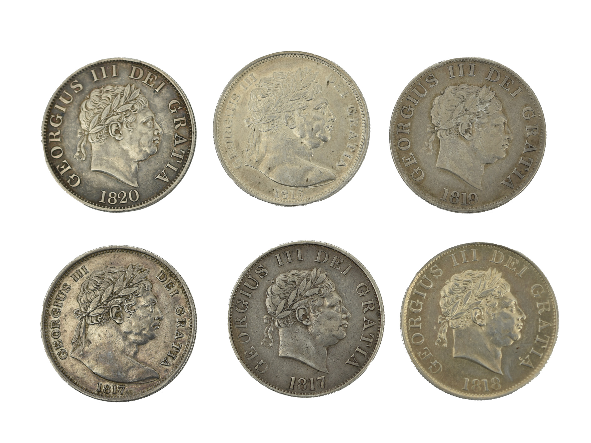 George III, silver halfcrowns (6), 1816 and 1817, large 'bull' head (S 3788), good very fine and very fine; 1817, 1818, 1819 and 1820, smaller head (S 3789), good fine, very fine, fine and good very fine with some toning. [6]