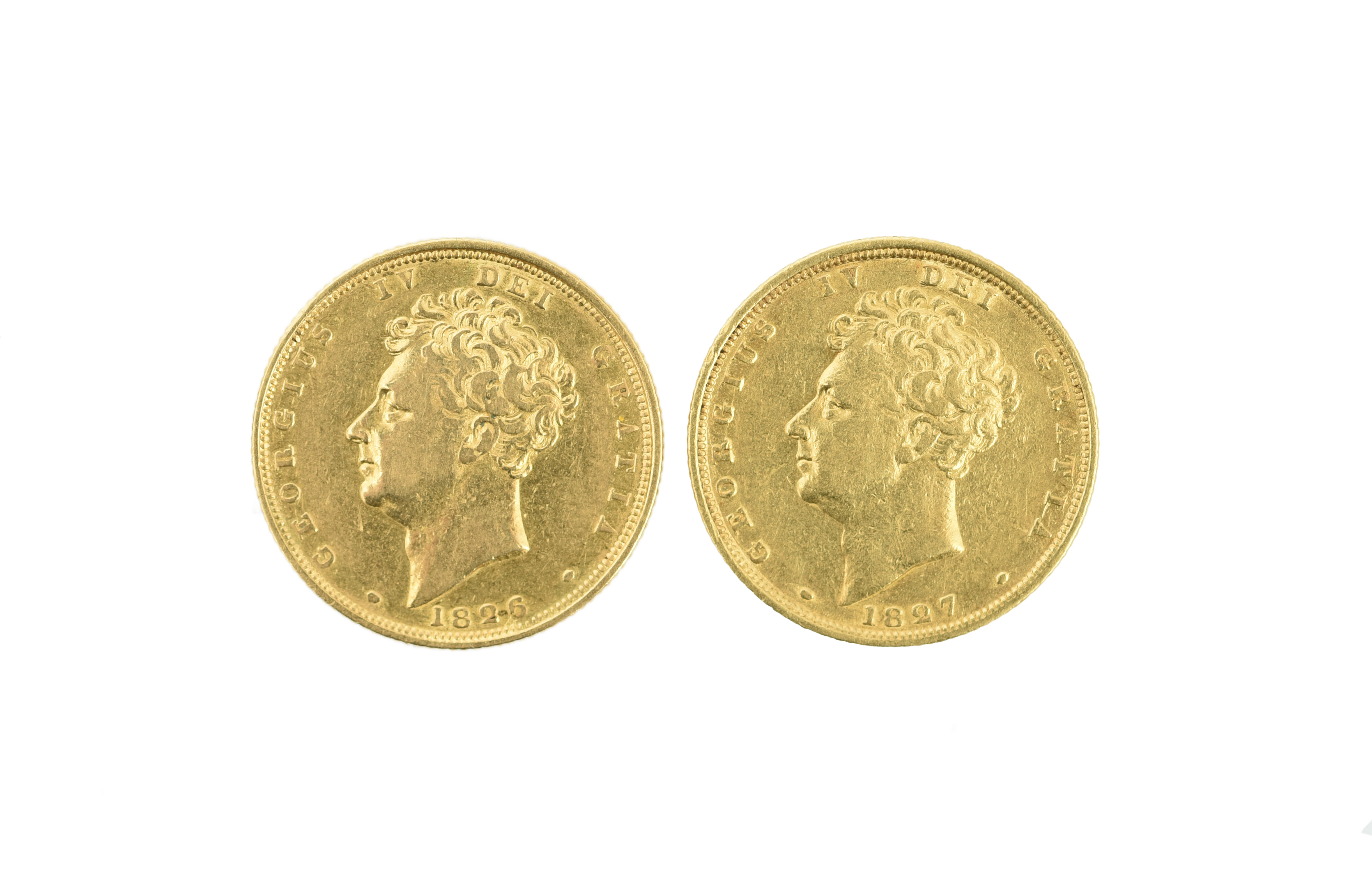 George IV, gold sovereigns (2), 1826 and 1827, second type, bare head with date below, rev. shield