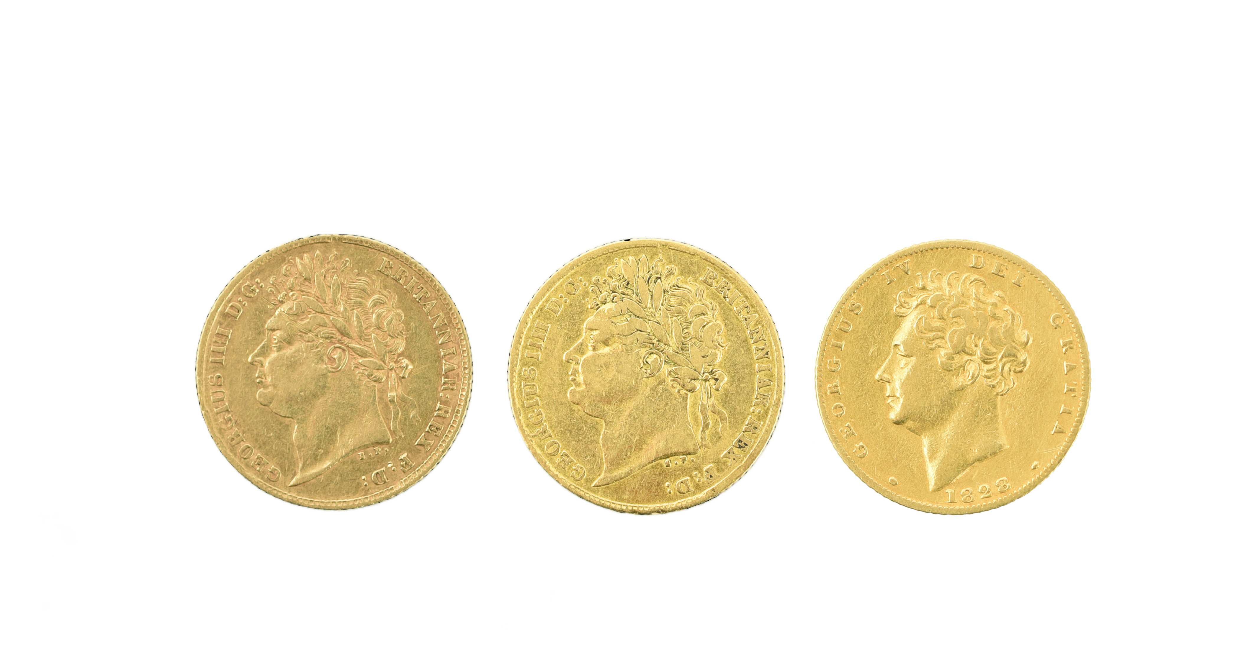 George IV, gold half sovereigns (3), 1823 and 1824, laureate head, rev. plain shield (S 3803), very fine and good fine; 1828, bare head, rev. garnished shield (S 3804), fine. [3]