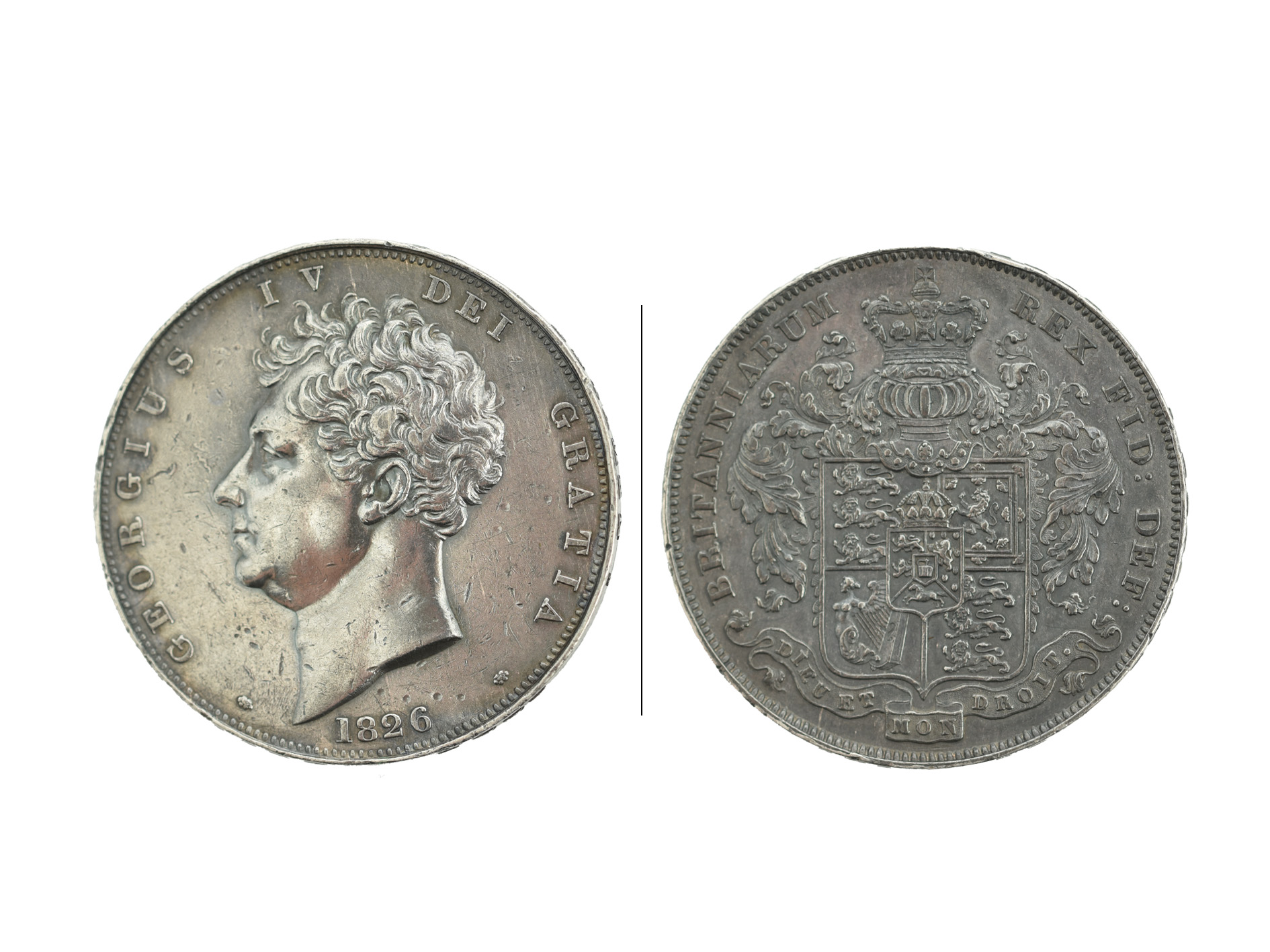 George IV, silver proof crown, 1826, bare head, rev. shield, edge SEPTIMO (S 3806), light wear to