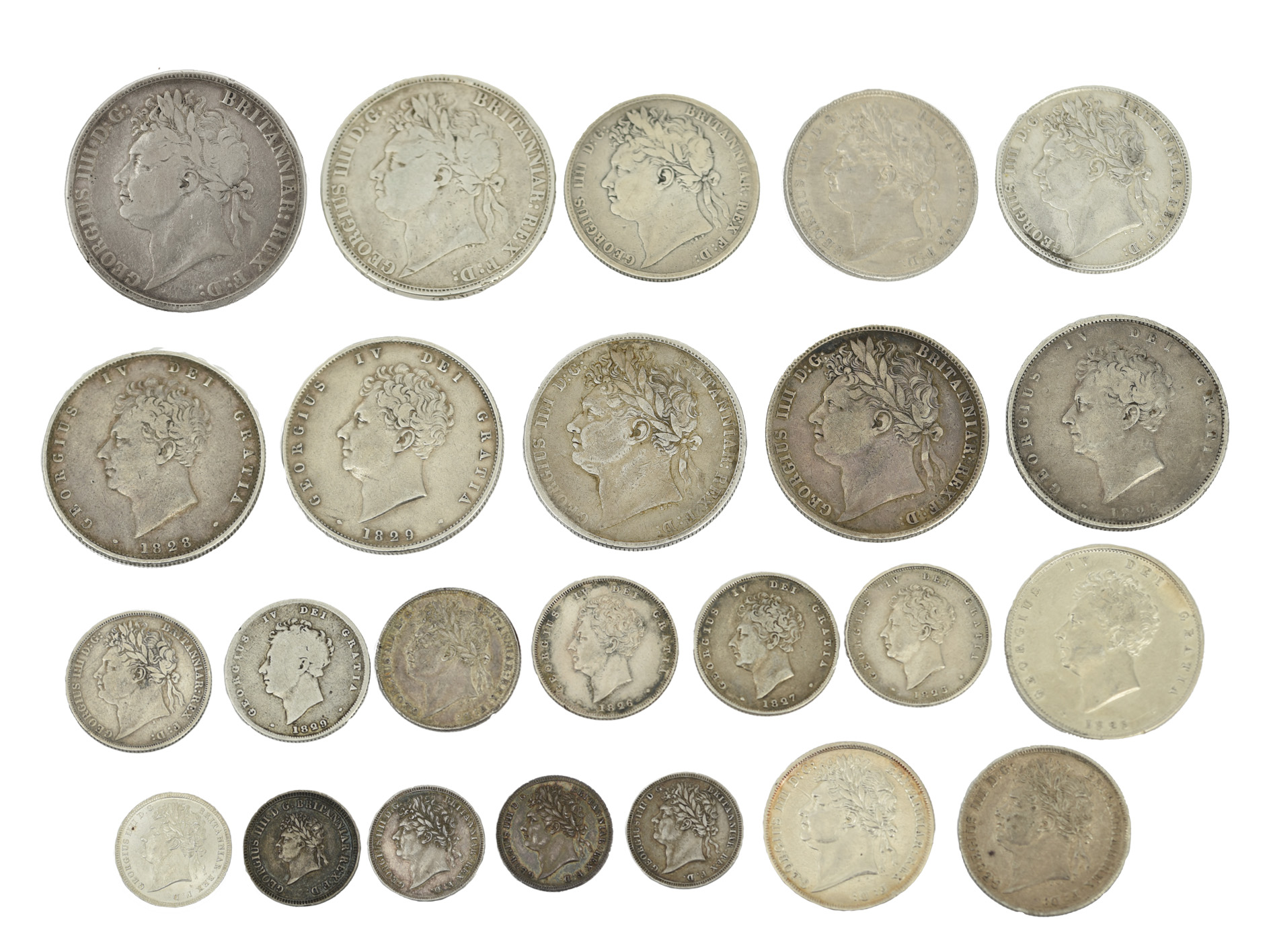 George IV, a quantity of silver coins, including: crowns (2), 1821 and 1822 (S 3805), fine or nearly so; halfcrowns (3), 1820, 1821 and 1825, laureate head, rev. garnished shield (S 3807), very fine, near very fine and fine; halfcrowns (2), 1823 and 1824, second reverse (S 3808), fine or better; halfcrowns (4), 1825, 1826, 1828 and 1829, bare head, third reverse (S 3809), all about good fine; and various shillings (8) and threepence (5), in varying grades. [24]
