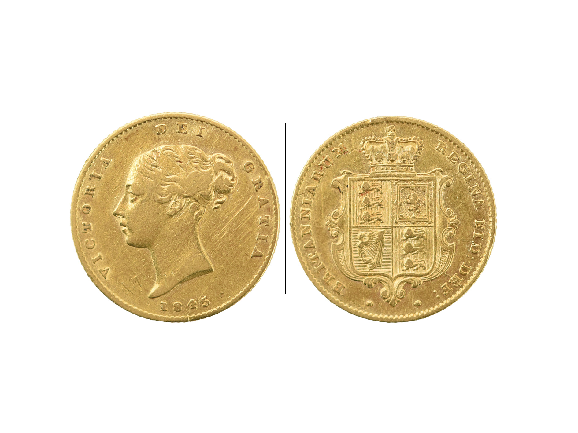 Victoria, gold half sovereign, 1845, first your head, date below (S 3859), good fine and scarce.