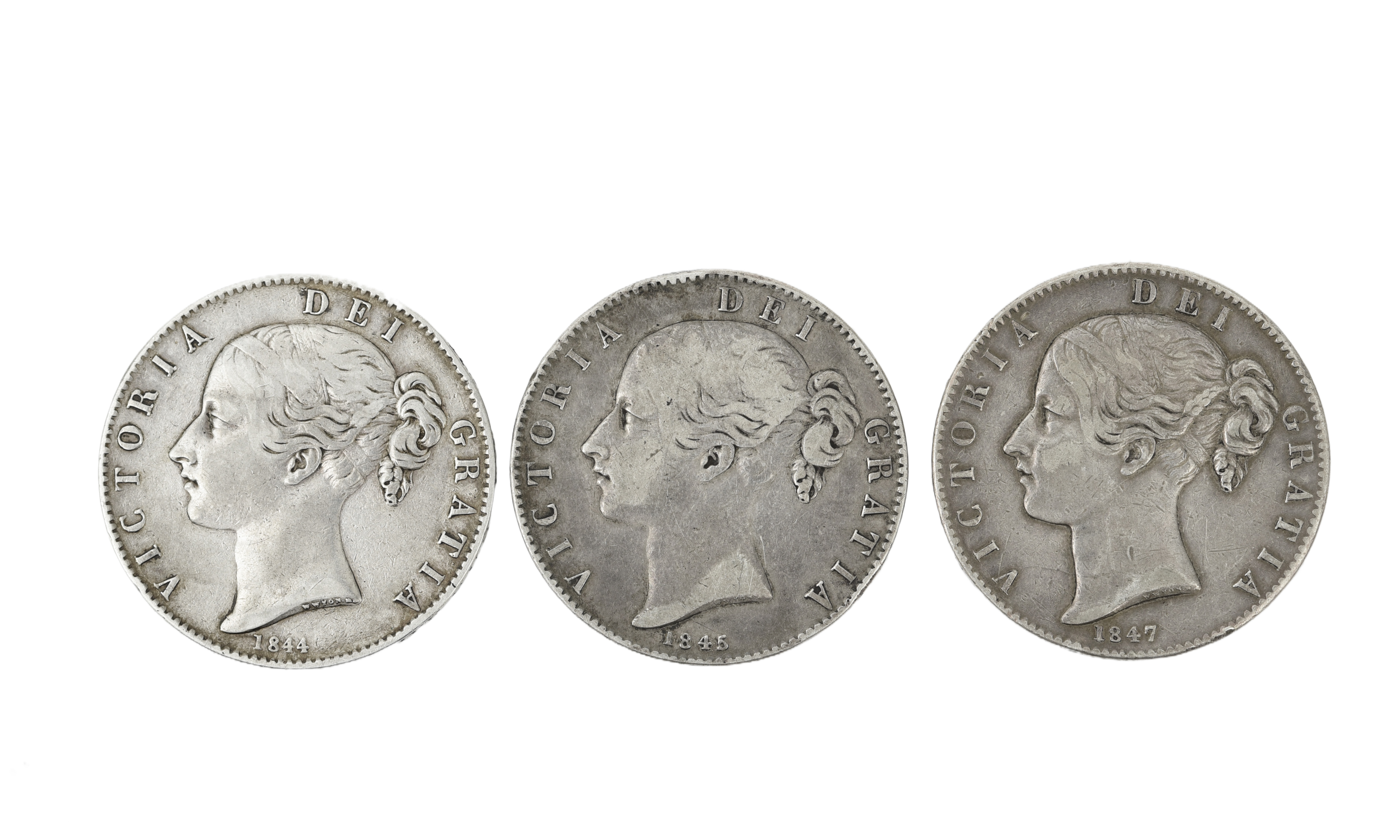 Victoria, silver crowns (3), 1844 (star stops), 1845 (cinquefoil stops), 1847 (S 3882), all fine or better. [3]