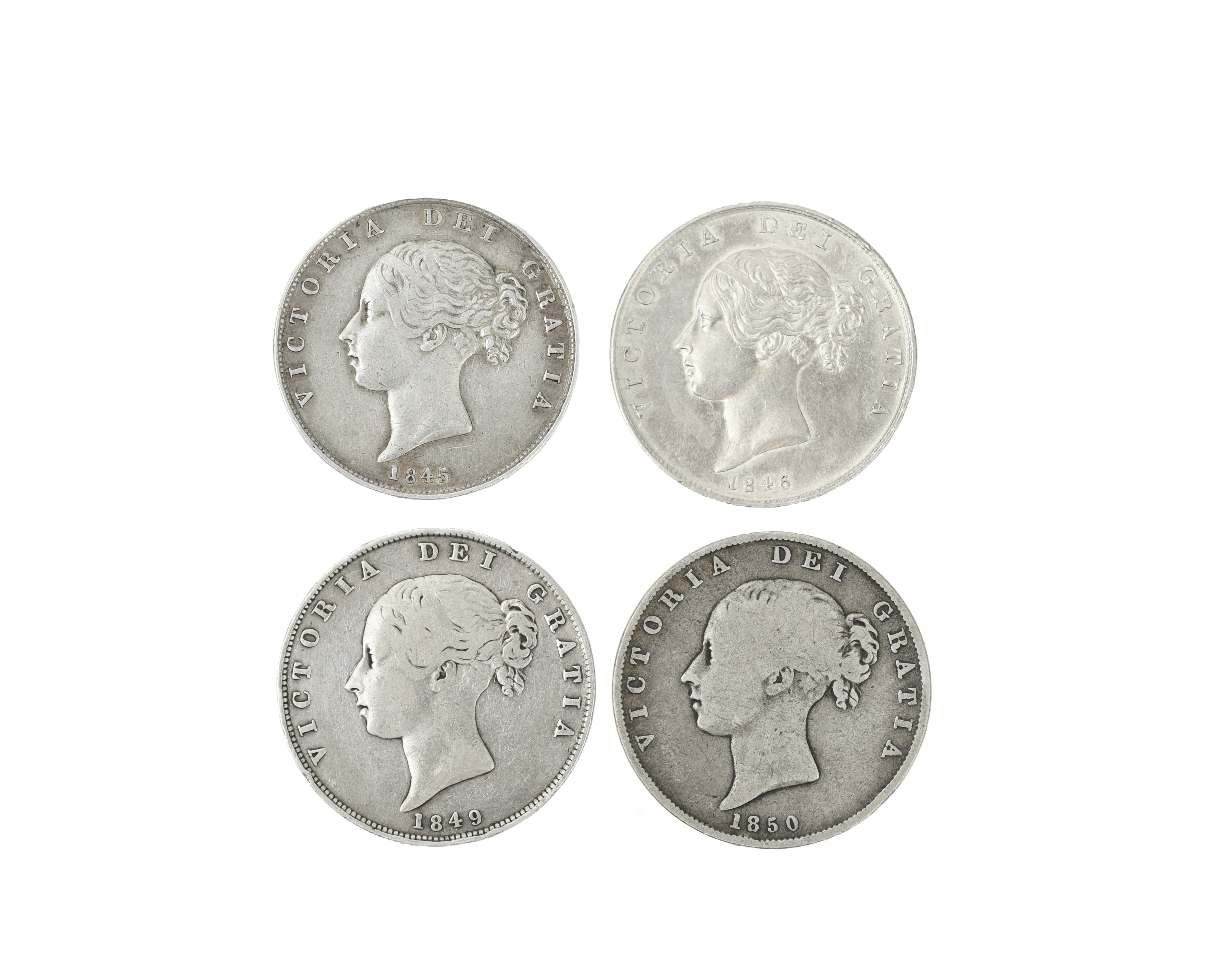 Victoria, silver half crowns (4), 1845 (5 over 3), 1846, 1849, 1850, young head, two plain fillets in hair, no initials on truncation (S 3888), good fine and scarce, nearly extremely fine, fine and fine. [4]