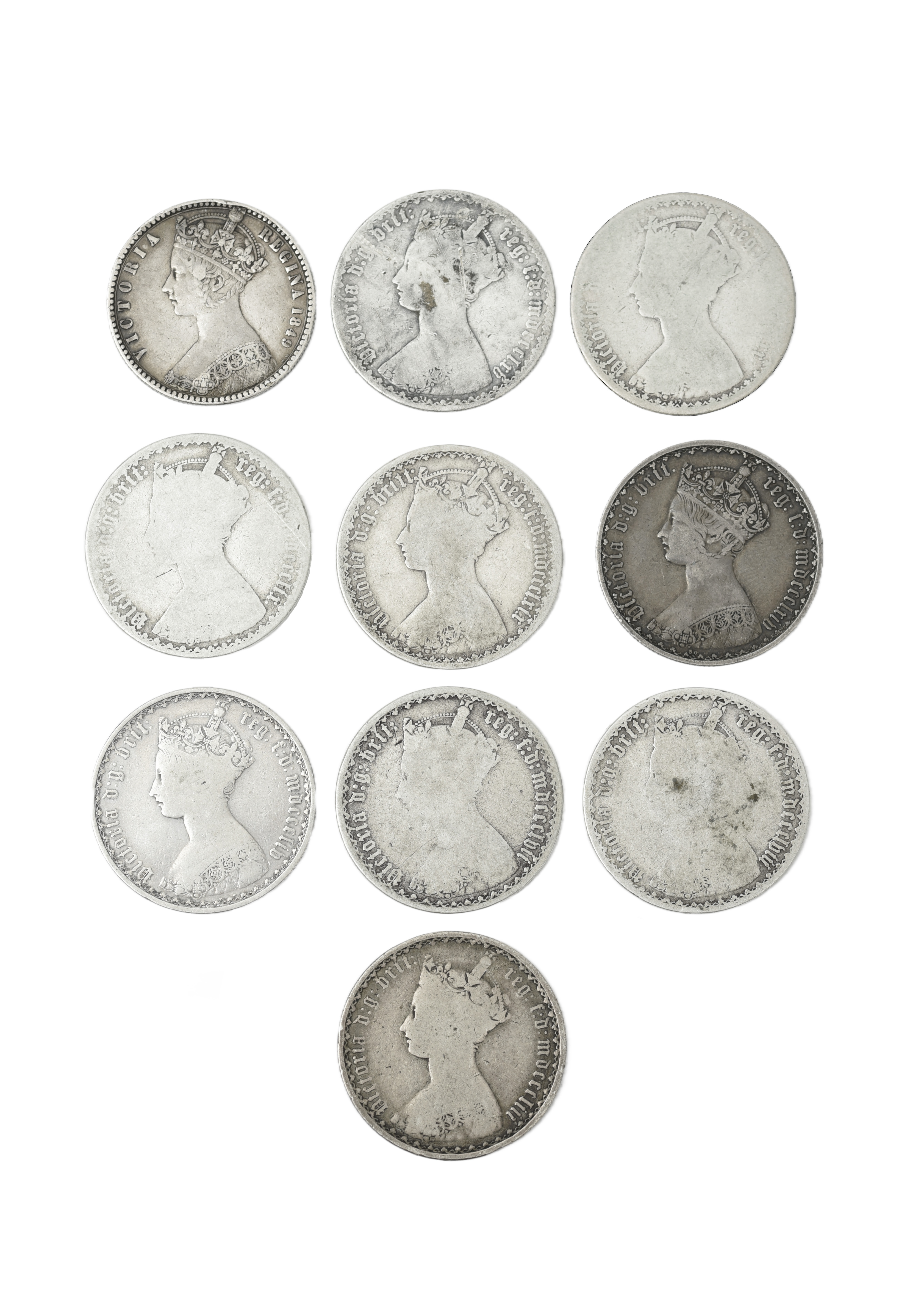 Victoria, silver florin, 1849, 'godless' type (S 3890), very fine or nearly so; together with silver florins (9), 'gothic' type, various dates, most fair, one fine. [10]