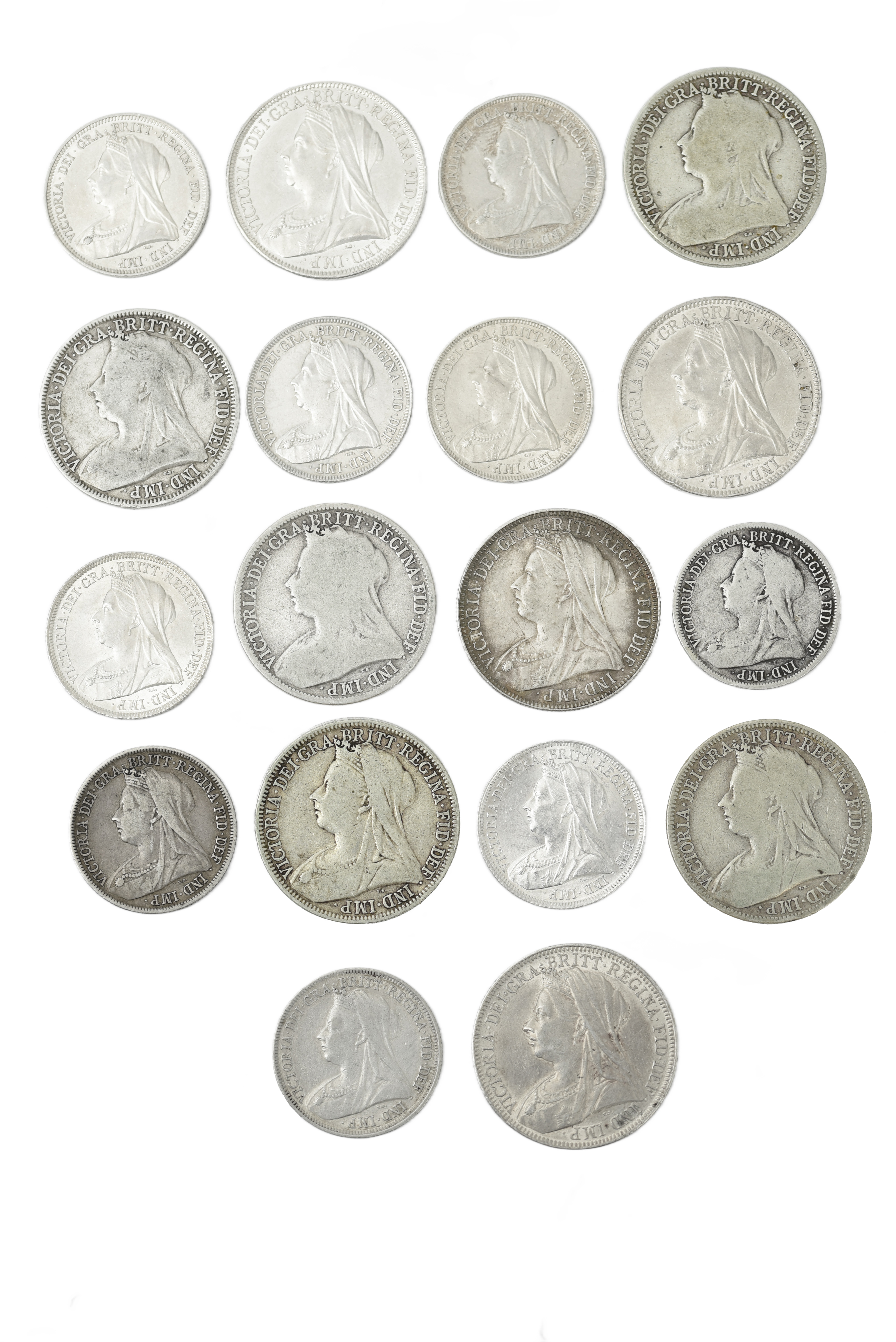 Victoria, silver florins (9), 1893, 1896, 1898 and 1901, veiled bust (S 3939), extremely fine or nearly so; five others, various dates, about fine; shillings (9), 1893, 1895-1897, 1900, veiled bust (S 3940), extremely fine or nearly so; and four others, various dates, fine to very fine. [18]