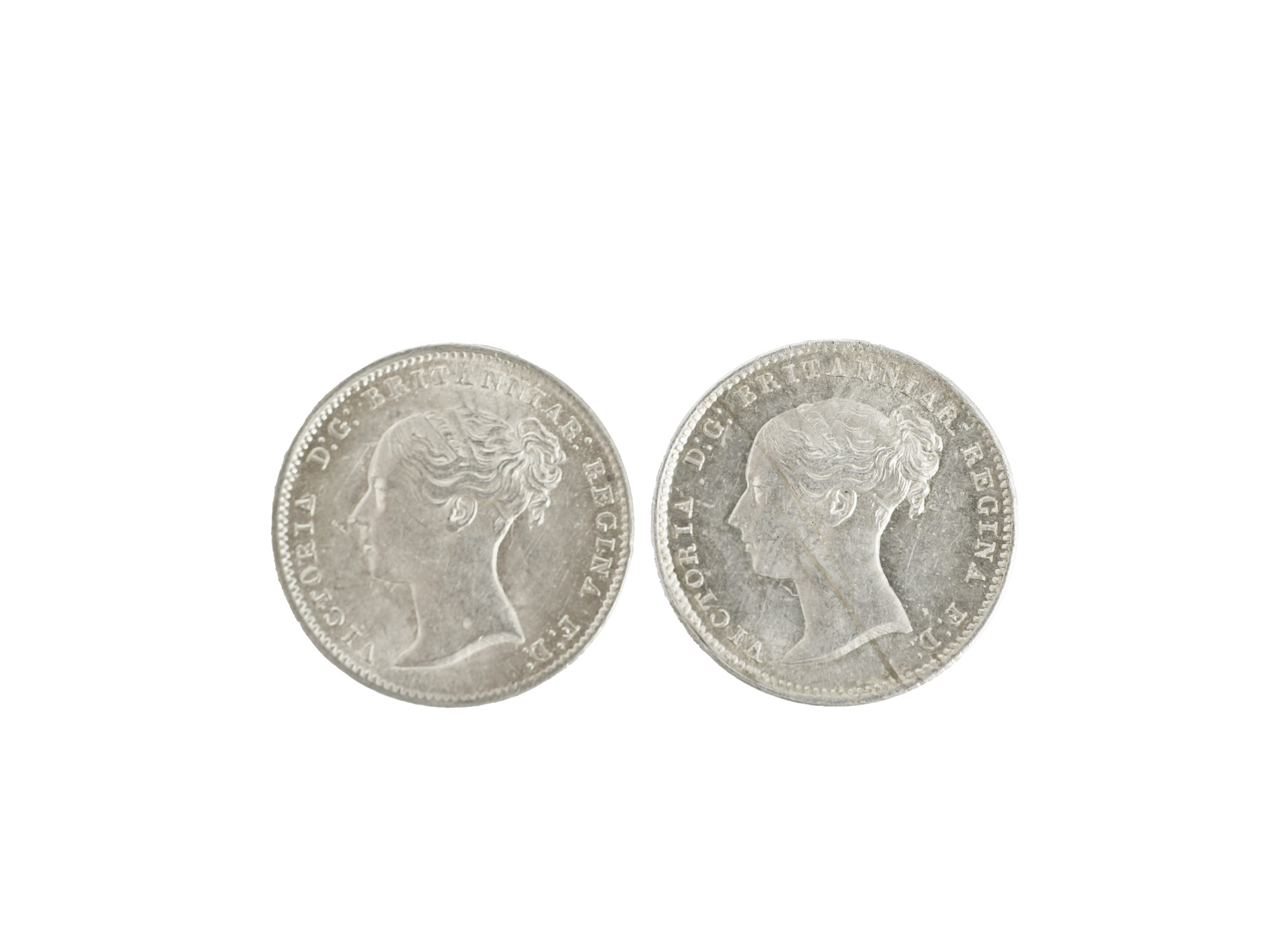 Victoria, silver threepence (2), 1854 and 1856, first young head (S 3914), the first with a dent in front of th enose, the other with light striations across the head, otherwise about extremely fine. [2]