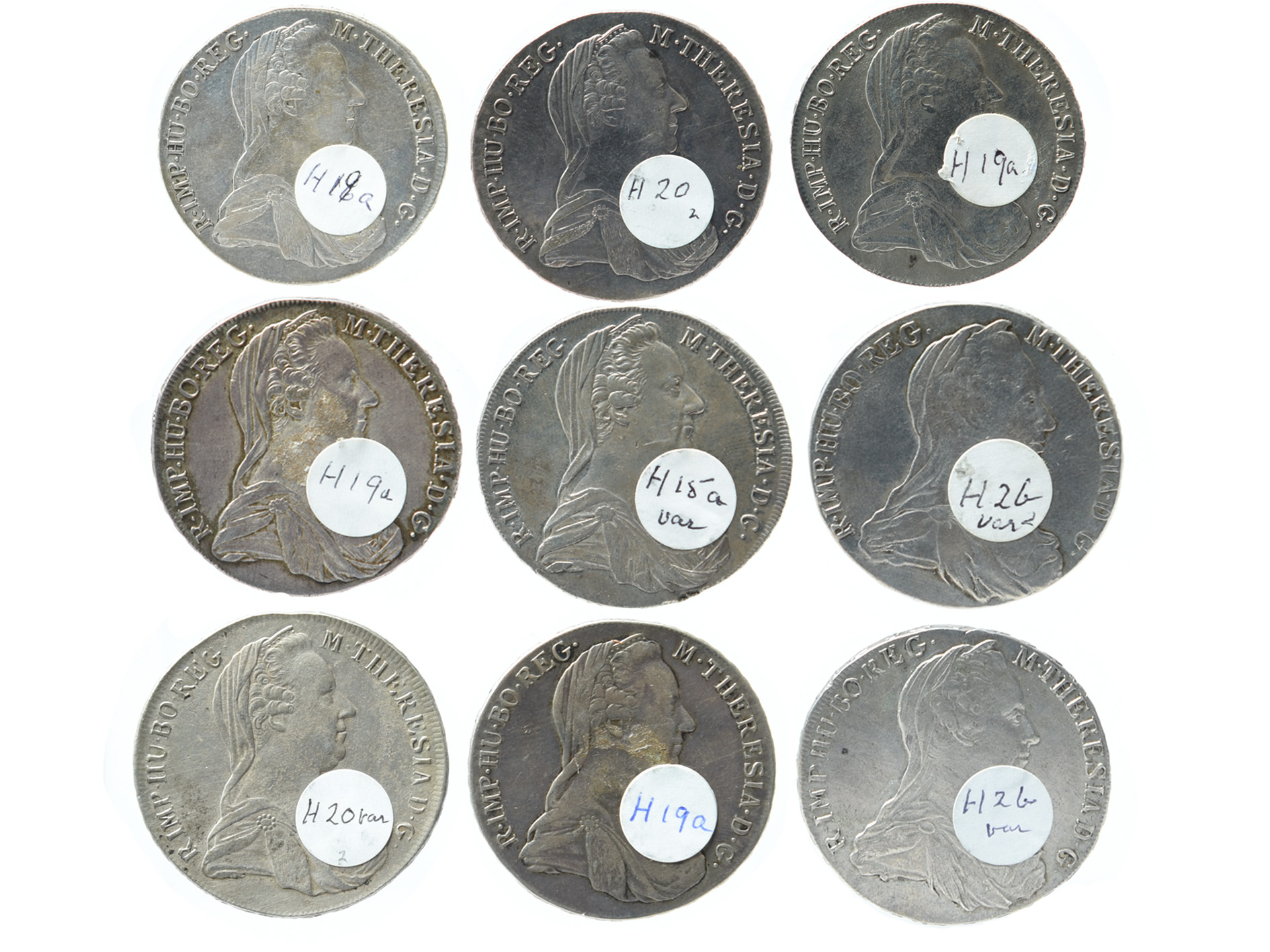 Austria: Maria Theresa, silver thalers (9), 1780 SF, restrikes, Vienna, struck c. 1790-95 (Hafner 15a), edge damage 5 o'clock, otherwise at least very fine; c. 1795-1803 (4) (Hafner 19a), near very fine; c. 1795-1803 (2), rev. AVST.DVX (Hafner 20 and variant), good very fine or better and near very fine; c. 1781-88 (2) (Hafner 26 or variant), edge bruising, about very fine. [9]
