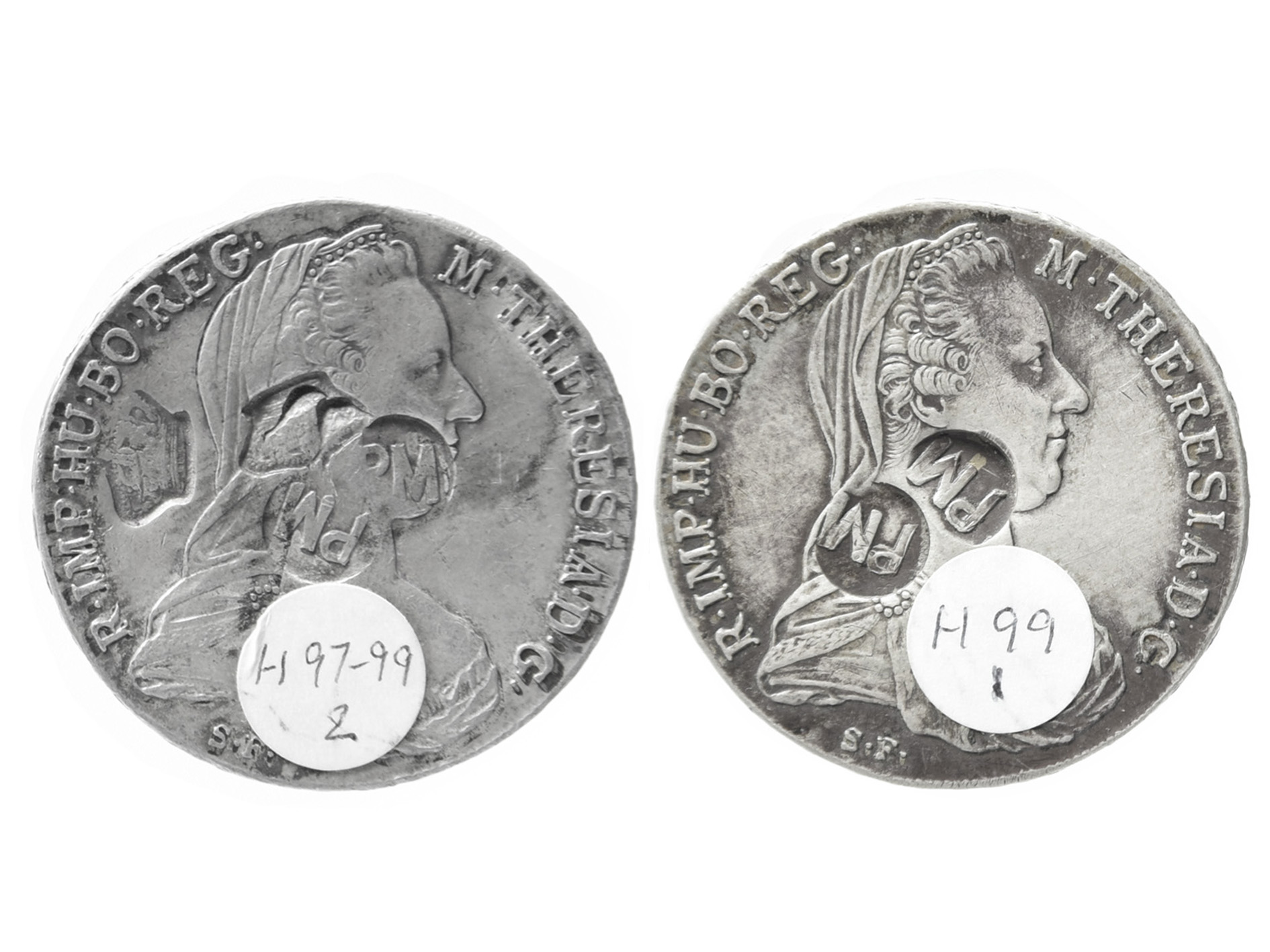 Portuguese colonies: countermarked coins (2): Azores & Mozambique, marks of a crown and 'PM' in a circle each struck twice to a Maria Theresa restrike thaler (Hafner 97 & 99), very fine; Mozambique, 'PM in a circle struck twice to a Maria Theresa restrike thaler (Hafner 99), very fine or better. [2]