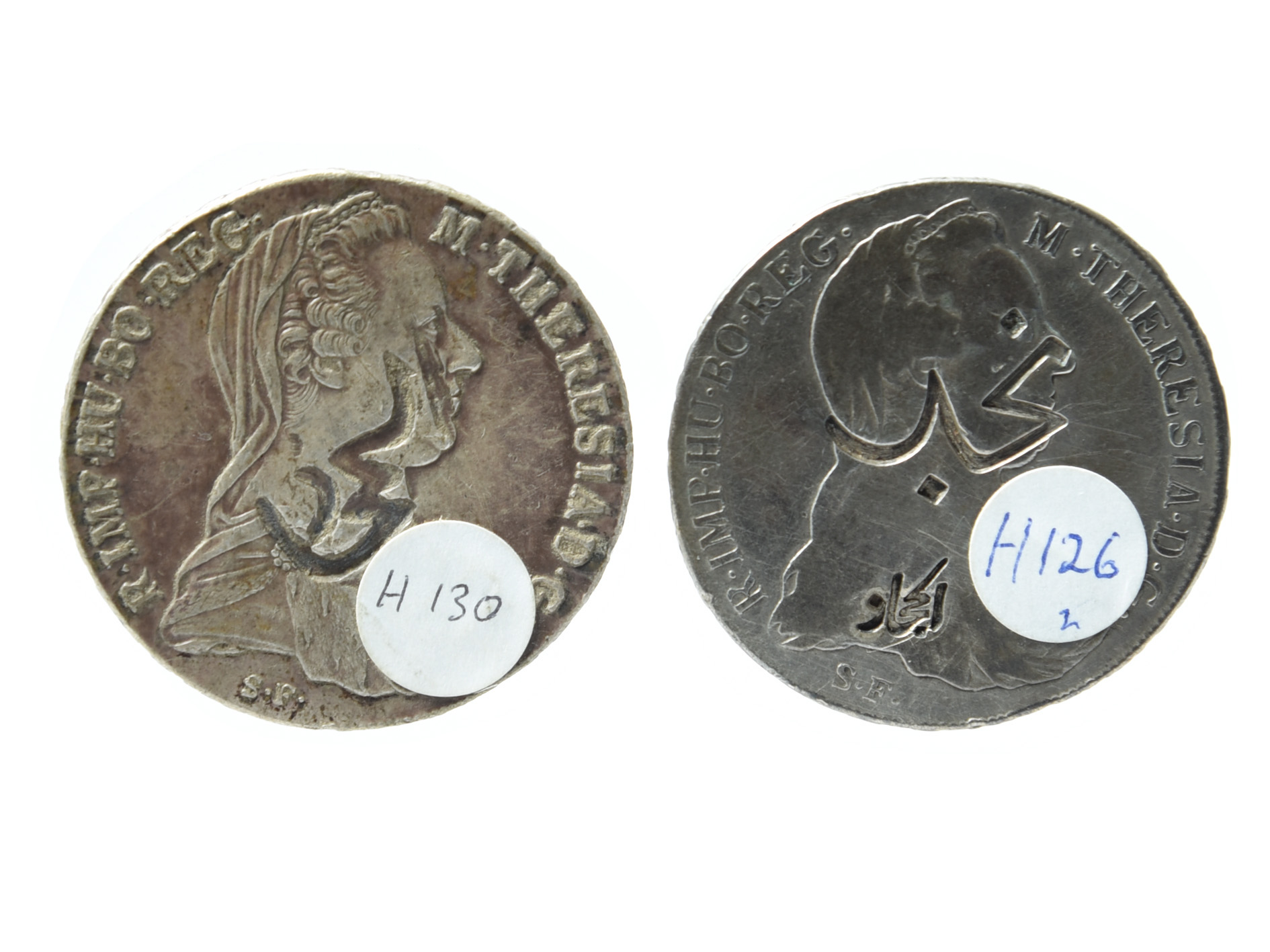 Hedjaz & Nejd: a countermarked Maria Theresa restrike thaler, struck with two character marks (Hafner 126), donor coin near fine, countermarks good very fine; and another similar coin, Hedjaz, struck with a bold character mark (Hafner 130), good fine. [2]