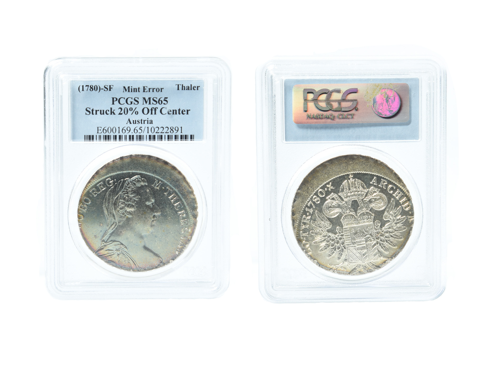 Austria: restrike silver thaler, 1780 SF, a mint error, struck off-centre, in PCGS slab, graded MS65 by PCGS.