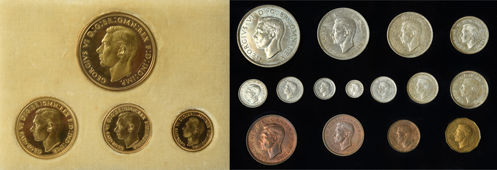 George VI, gold proof coin set, 1937, four coins, five pounds to half sovereign, plain edges, in maroon leather case of issue (S PS15), light surface marks; together with another proof set, 1937, fifteen coins, crown to farthing, including maundy coins, in maroon leather case of issue (S PS16), some mottled toning, otherwise about as struck.