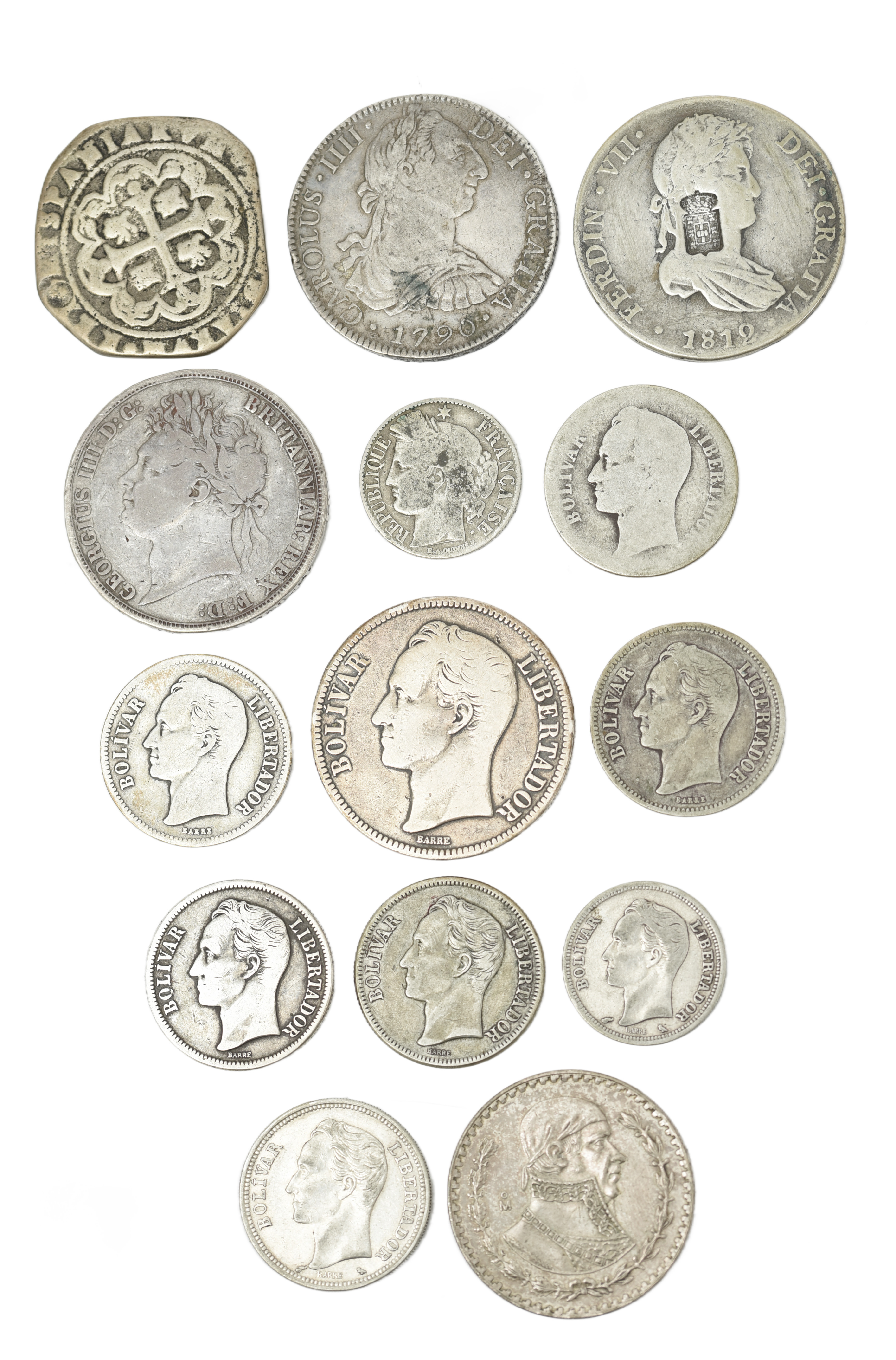 A small quantity of silver coins, including: George IV, crown, 1822, edge TERTIO (S 3805), fine or a little better; Mexico - Spanish Colony: Charles IV, eight reales, 1790 (KM 108), very fine or nearly so; Portugal: 870 reis, countermark on a Mexican 8 reales, no date (1834) host coin 1812 (KM 440.15), fine, countermark very fine; and other items. [qty]